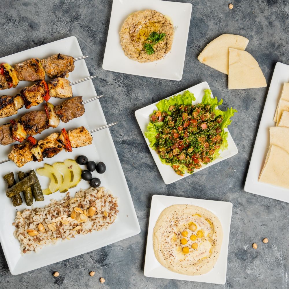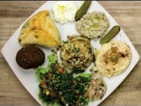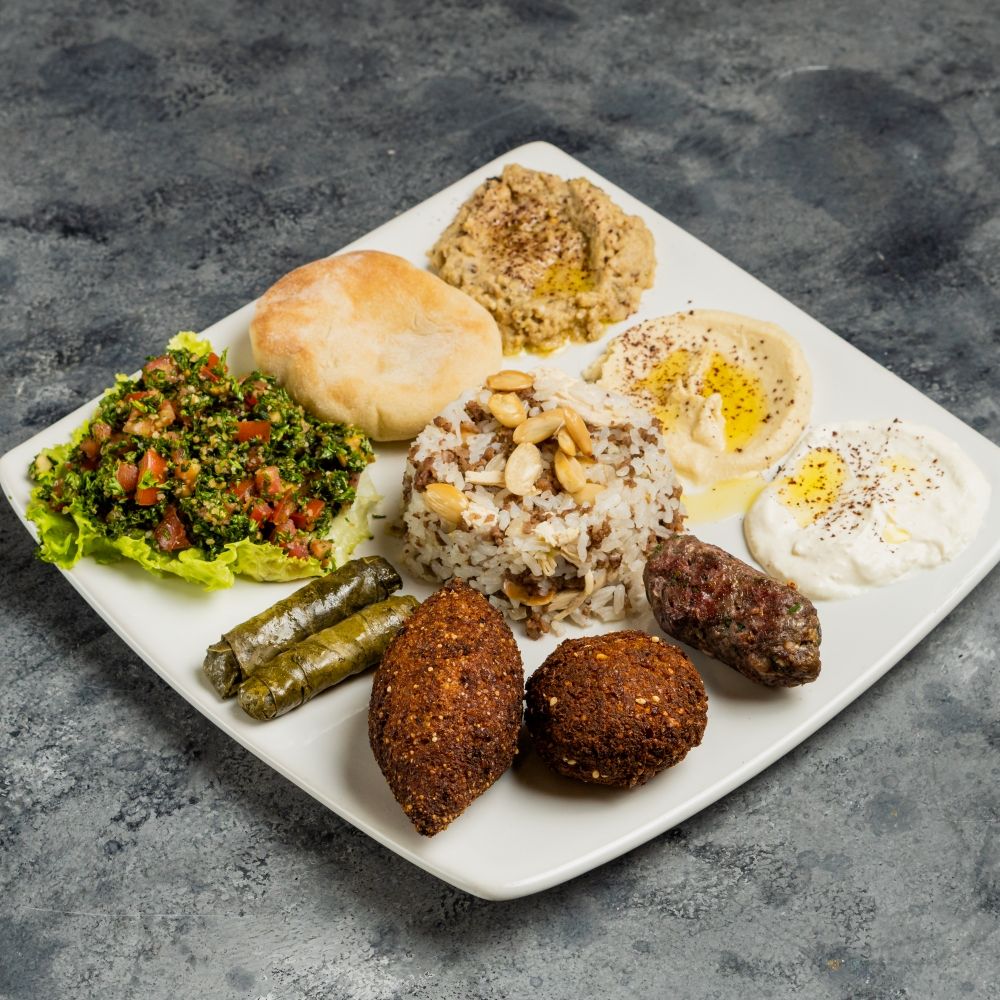 Arroz con almendras, tabbule, hummus, kibbe, falafel, kaffa de res, hojas de parra y pan árabe + Limonada