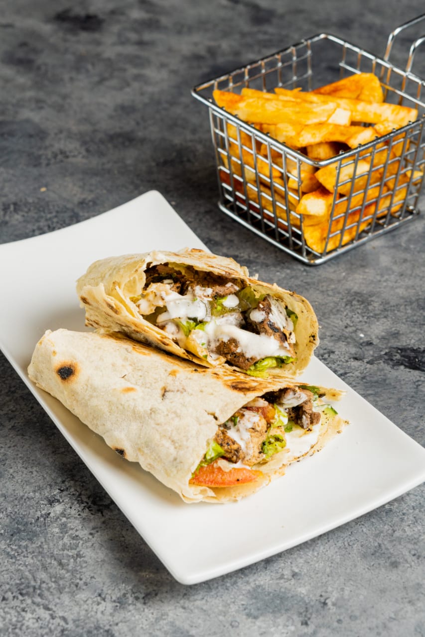 Tres deliciosos shawarmas mini, acompañado de papas a la francesa.