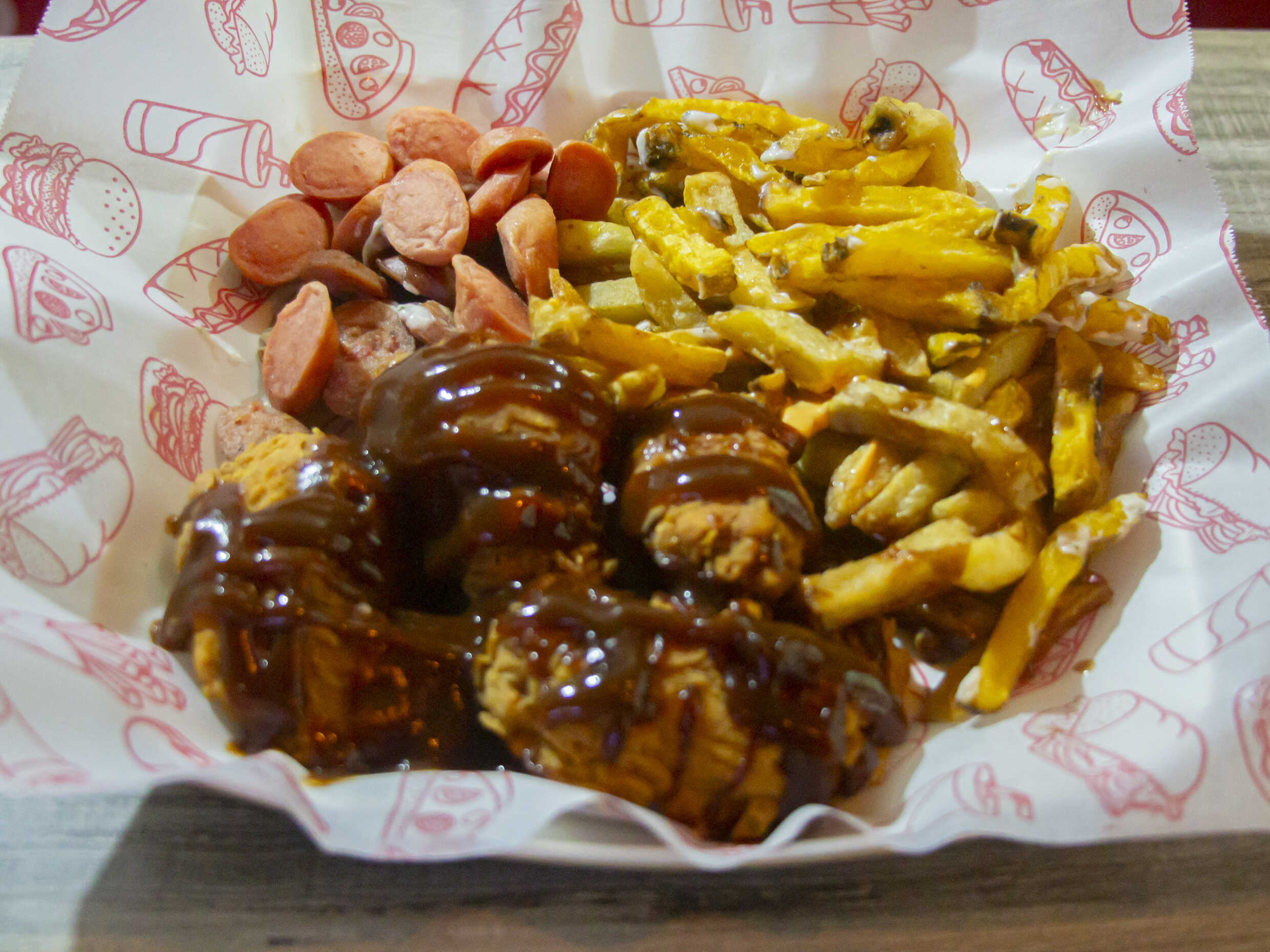 Papa francesa, 4 piezas de alitas BBQ, salchicha americana, chorizo y papa criolla picada