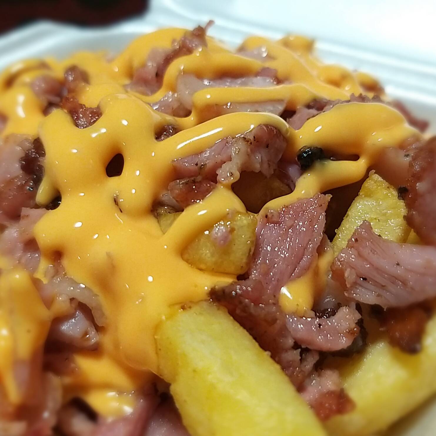 Papas horneadas, queso, tocineta, salsa de la casa y salsa de queso cheddar.