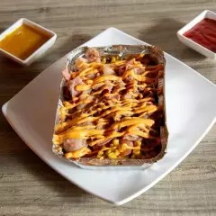 Papas horneadas, queso cheddar, tocineta, maíz, salchicha, salsa de la casa, salsa de queso cheddar, salchicha sencilla y tocineta.