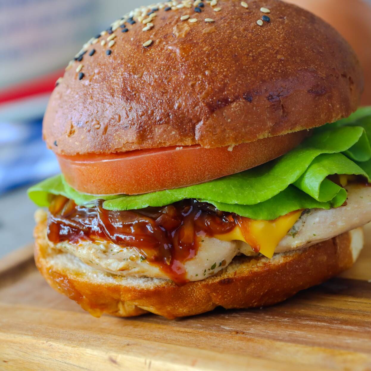 Pechuga a la plancha , queso, cebolla, tomate, lechuga, salsas de la casa, pan, huevo de codorniz y papa chip.