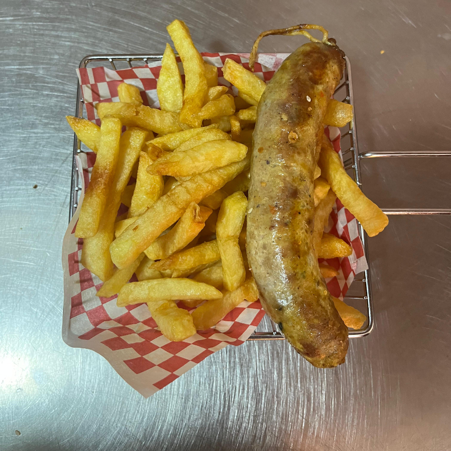 Chorizo servido con papas a la francesa.