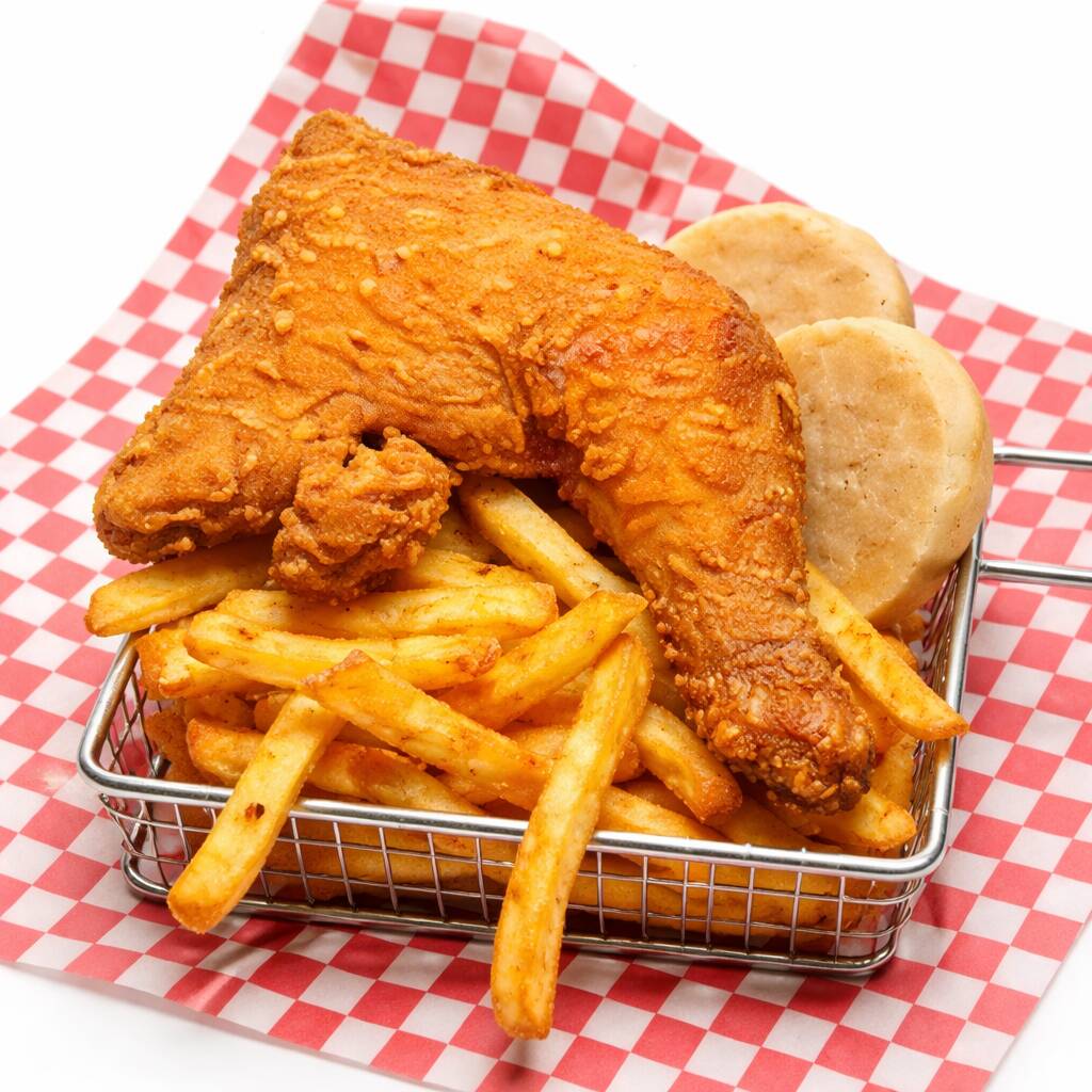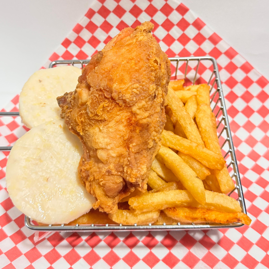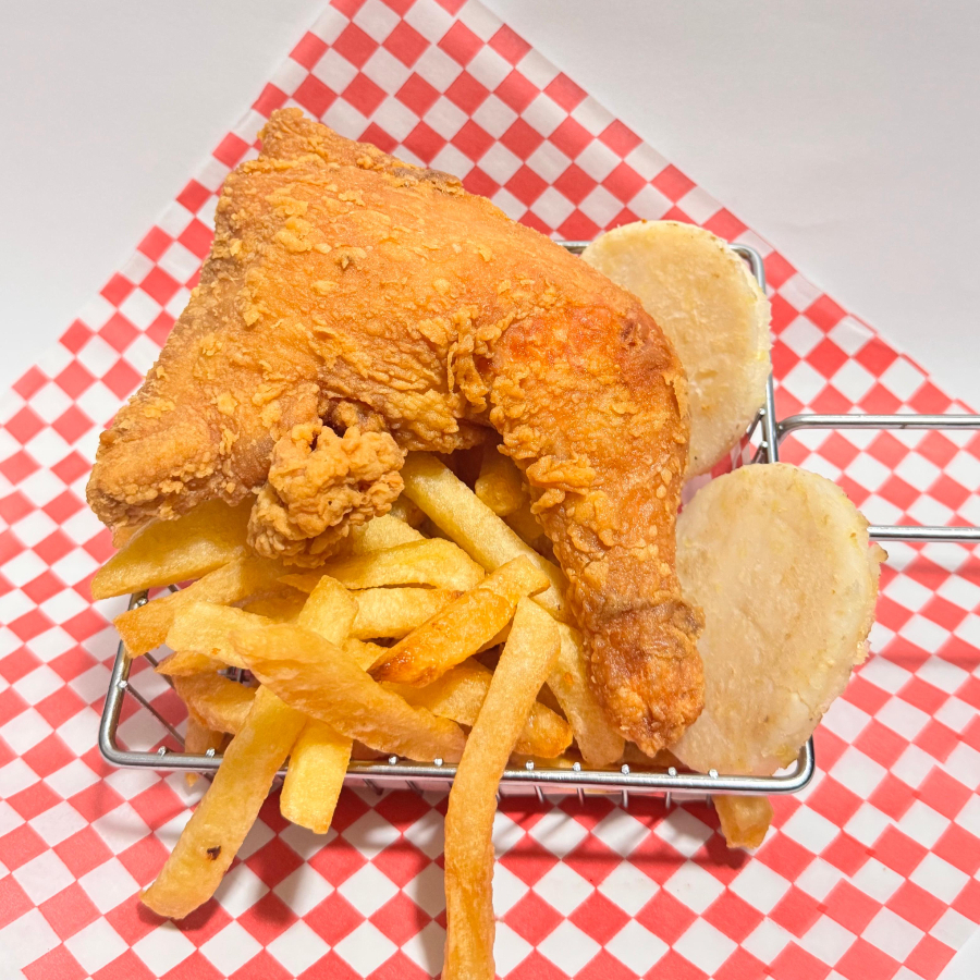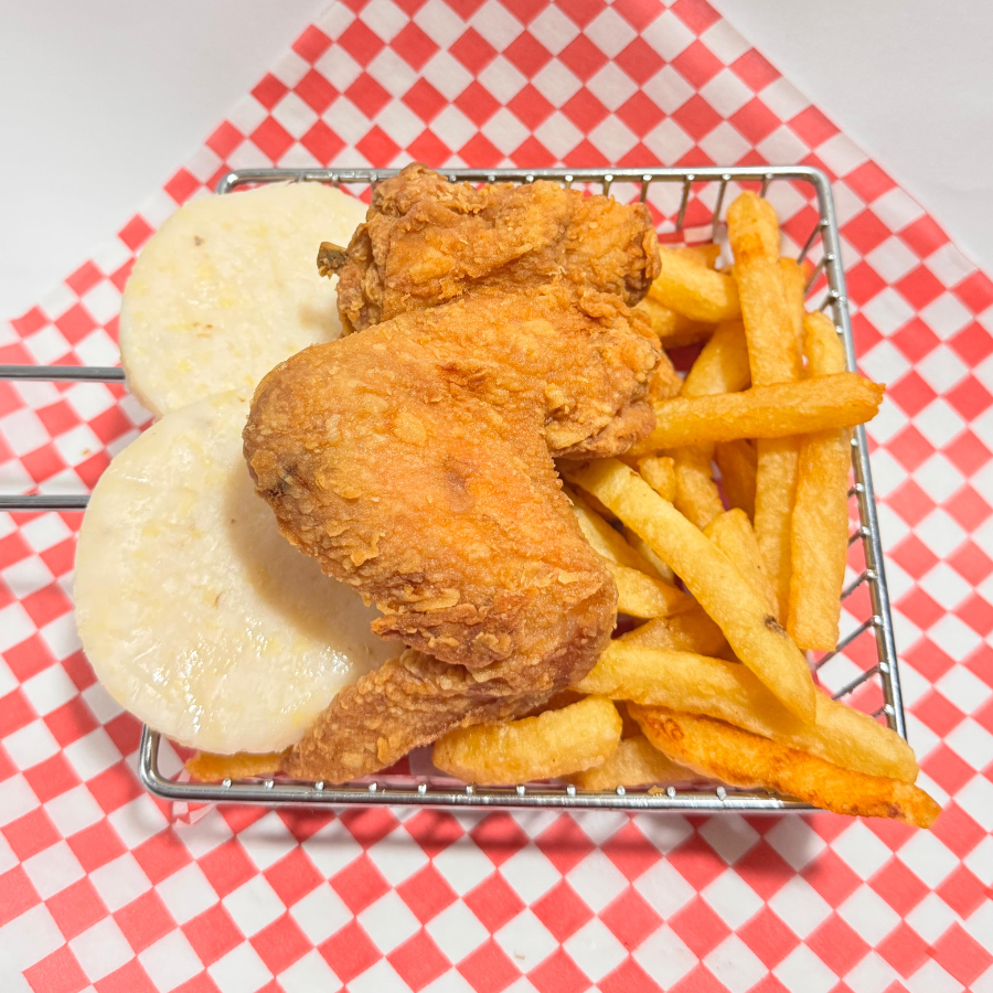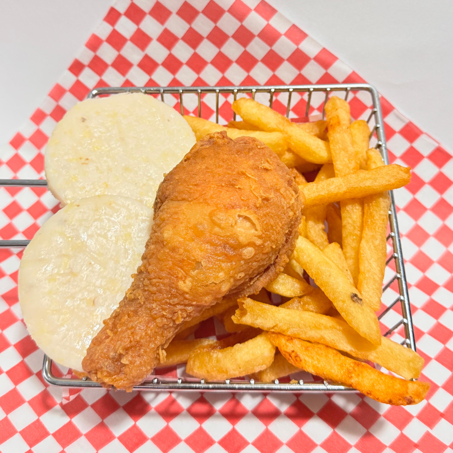 Combo de un cuarto de pollo, arepa y papas a la francesa.