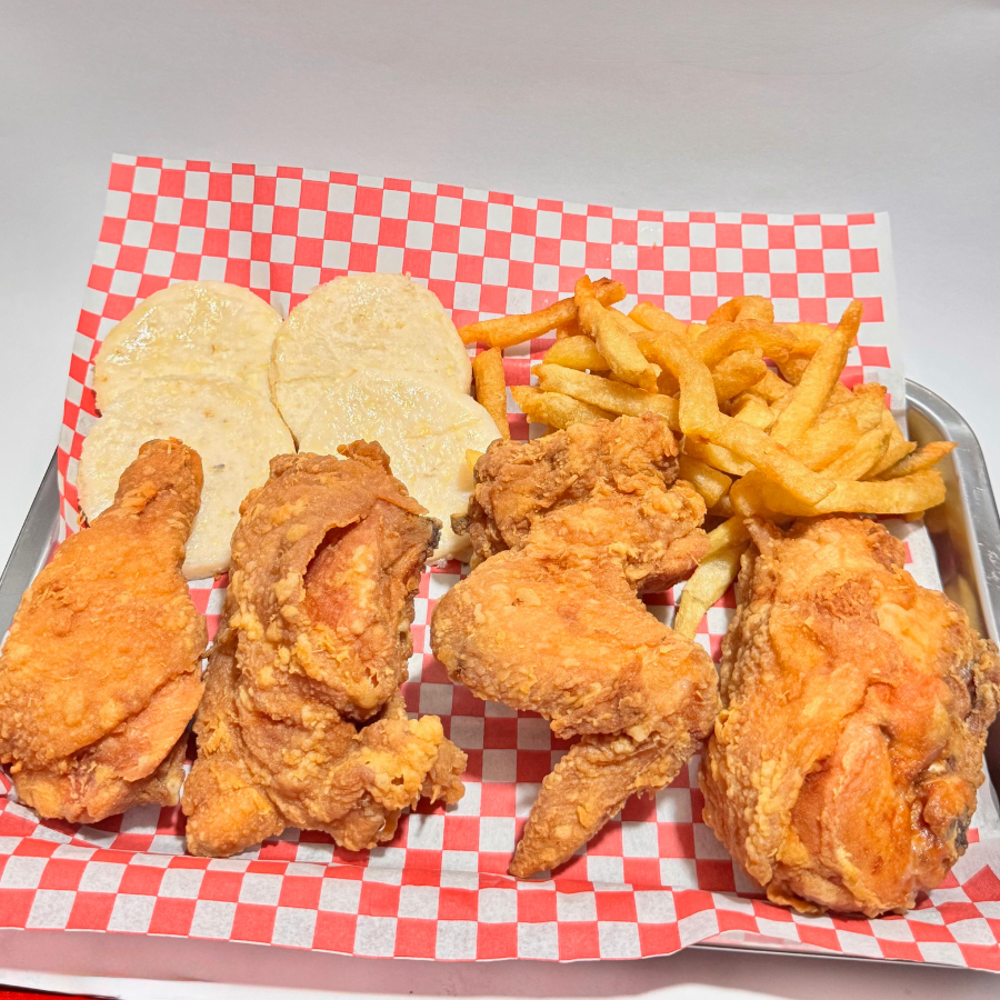 4 pzas De alas con una salsa de la casa, papa francesa