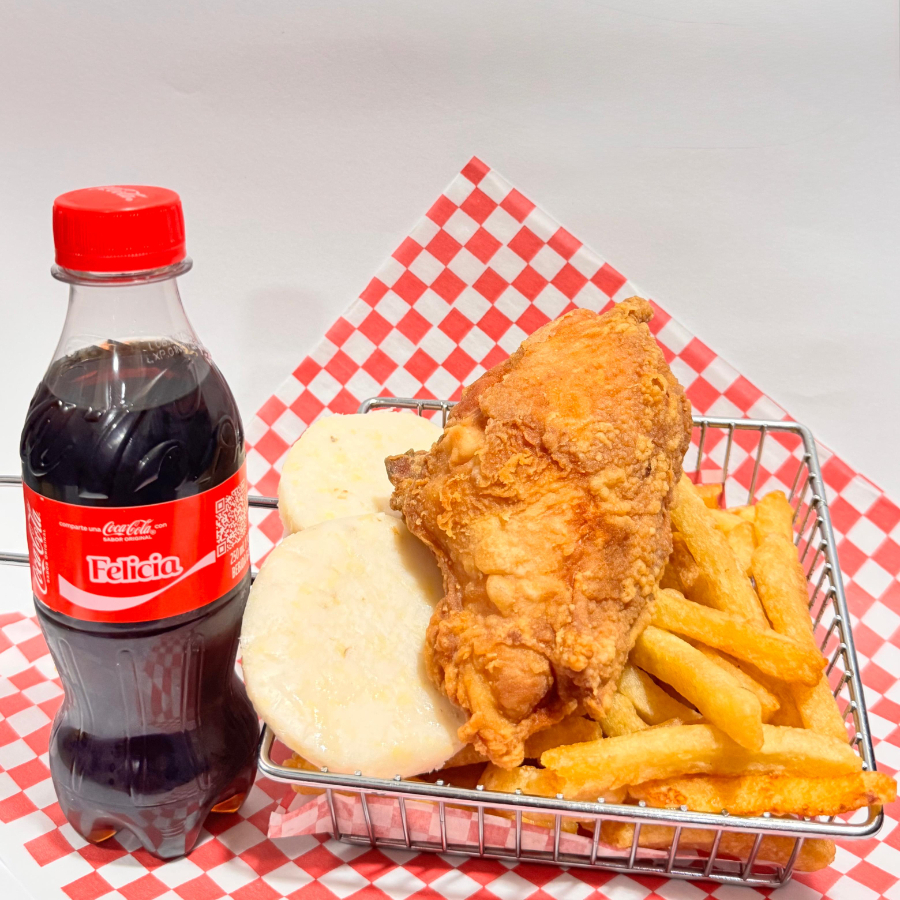 Combo de un cuarto de pollo, arepa, papas a la francesa+ gaseosa 250 ml coca cola.