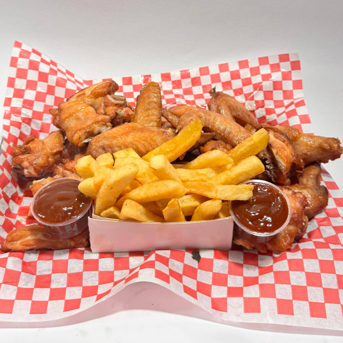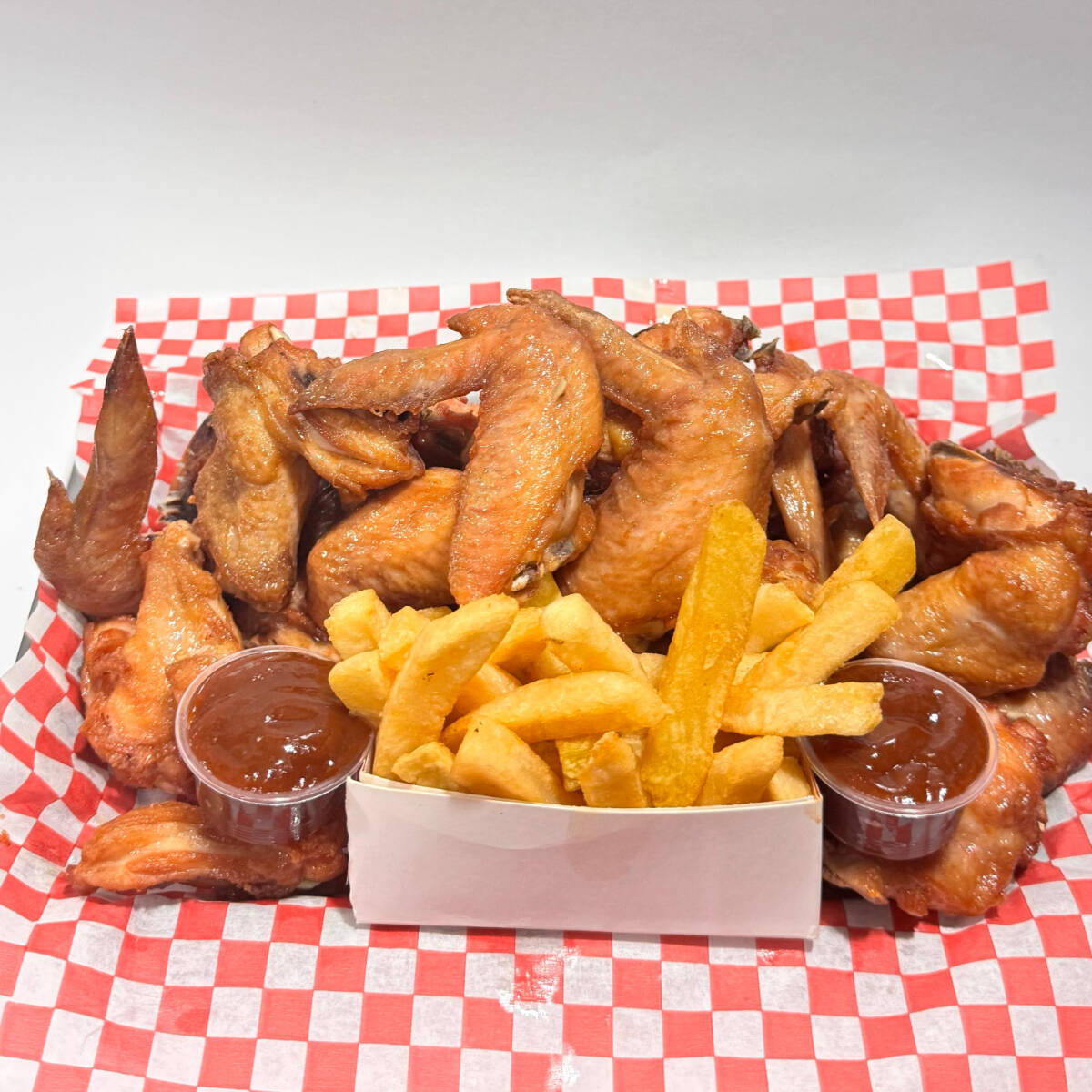 50 pzas De alas con dos salsa de la casa, papa francesa