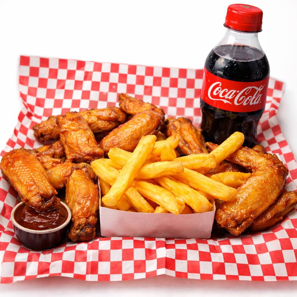 4 pzas De alas con una salsa de la casa, papa francesa + gaseosa 250 ml coca cola.