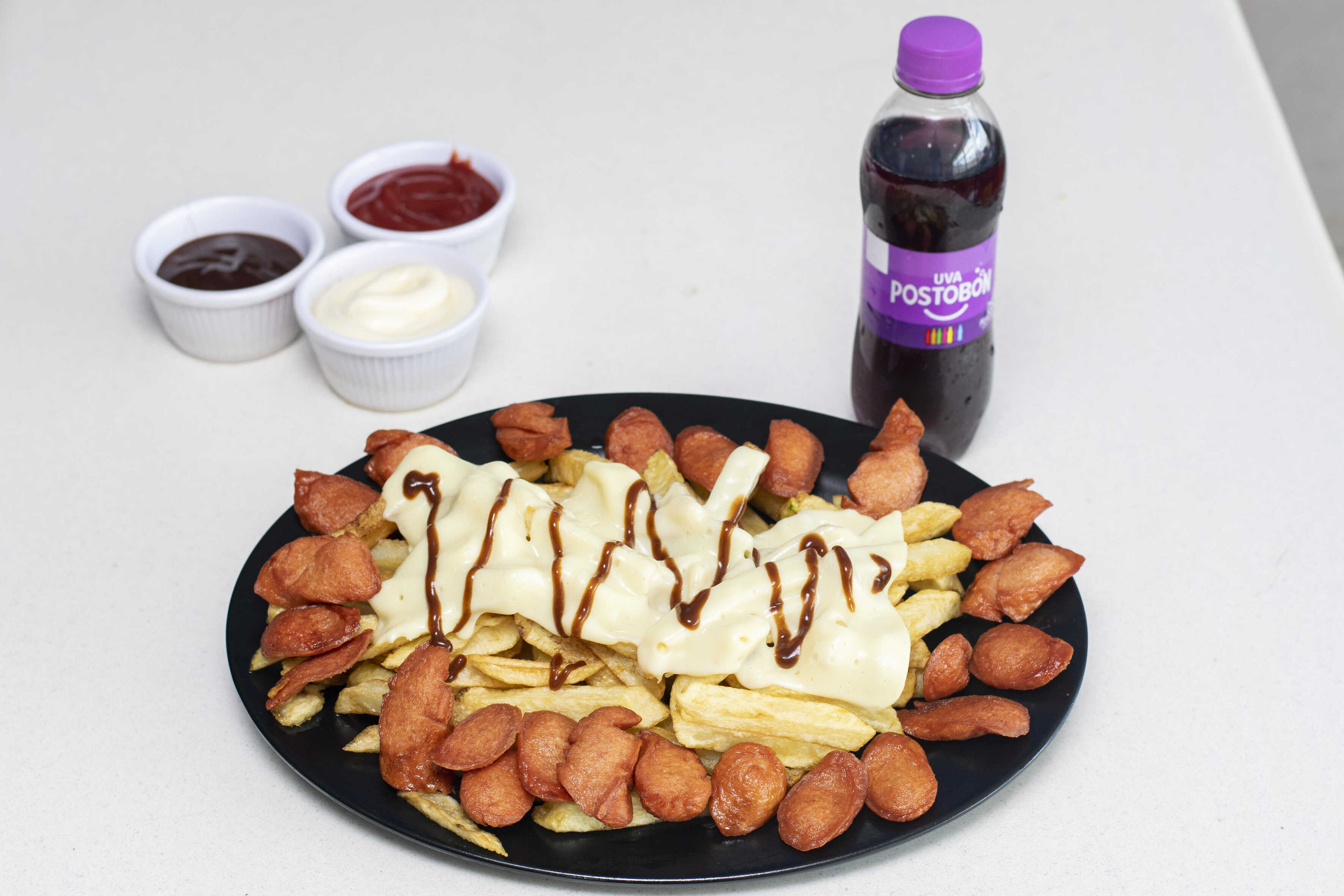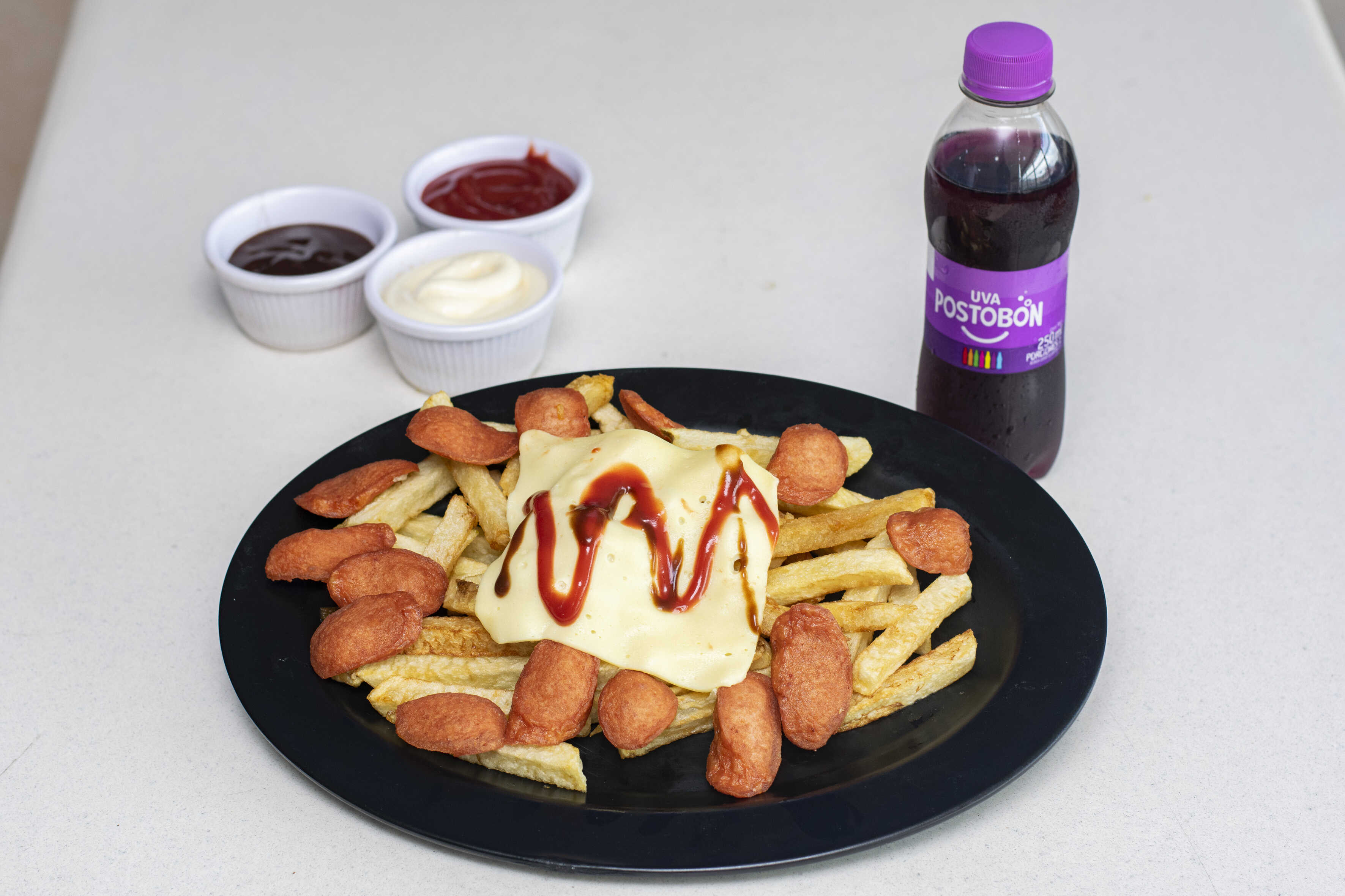2 Porciones de papa francesas, 1 salchicha americana extrema, queso, salsas más gaseosa gratis 250 ml (según disponibilidad en tienda).