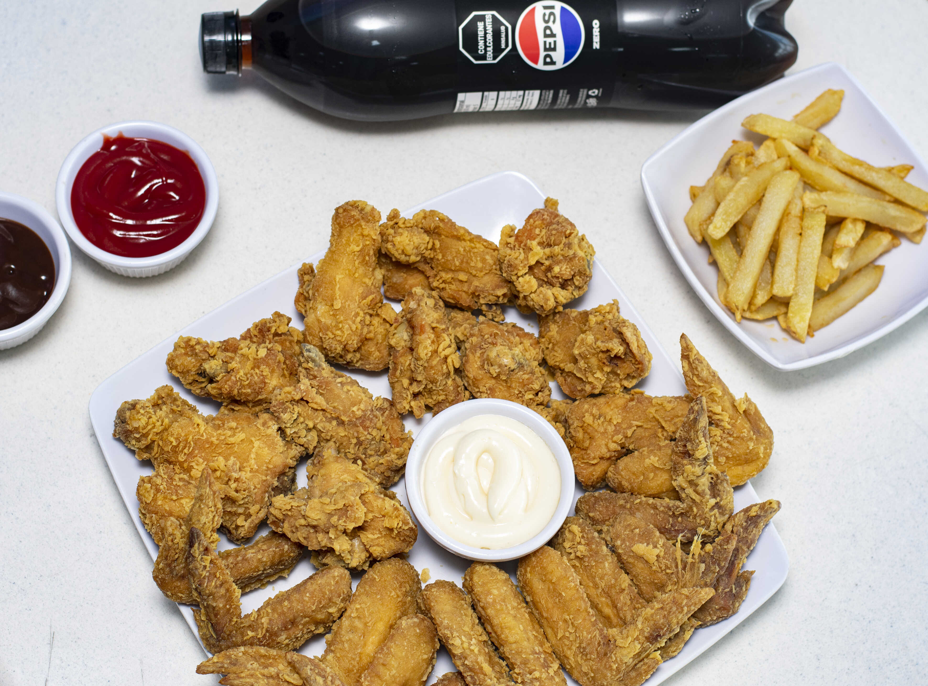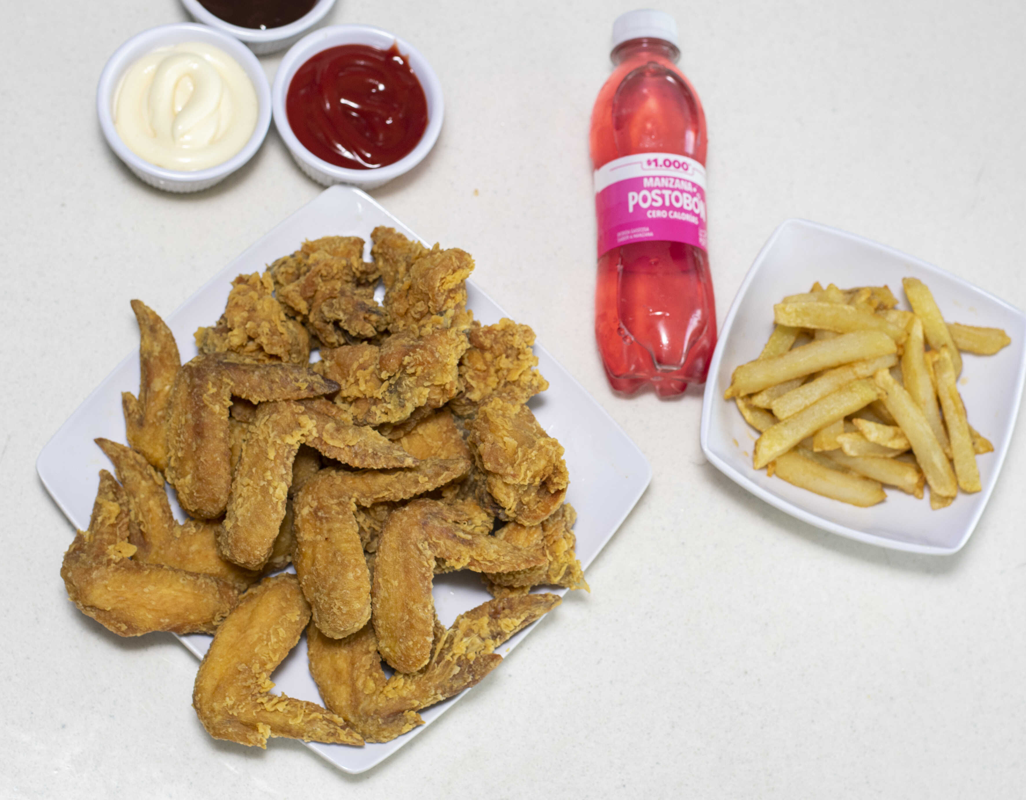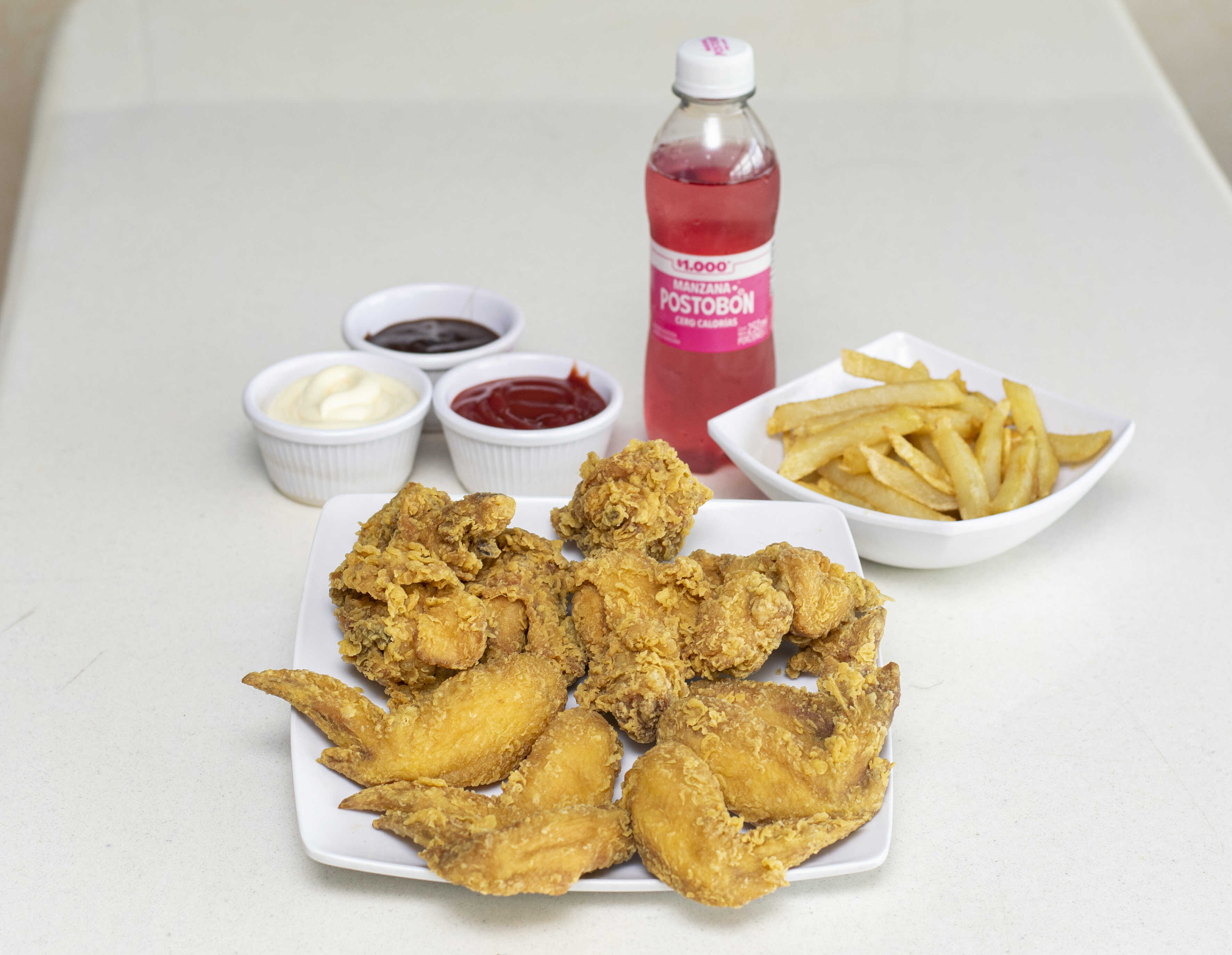 20 pzas De alas apanadas, 2 porciones de francesa, salsas de su elección, gaseosa 250 ml gratis según disponibilidad en tienda.