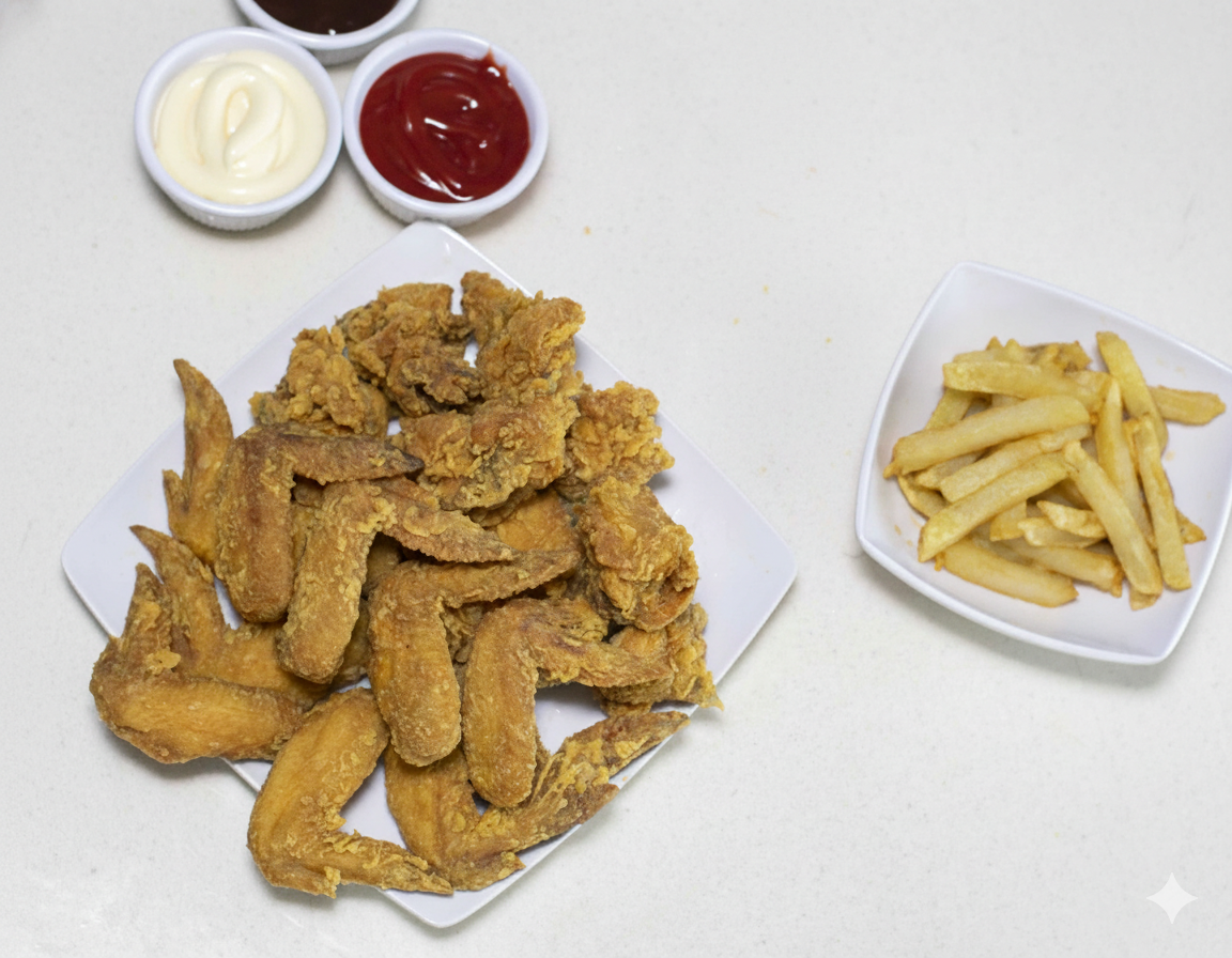20 piezas de alas apanadas, 2 porciones de papa francesa y salsas.