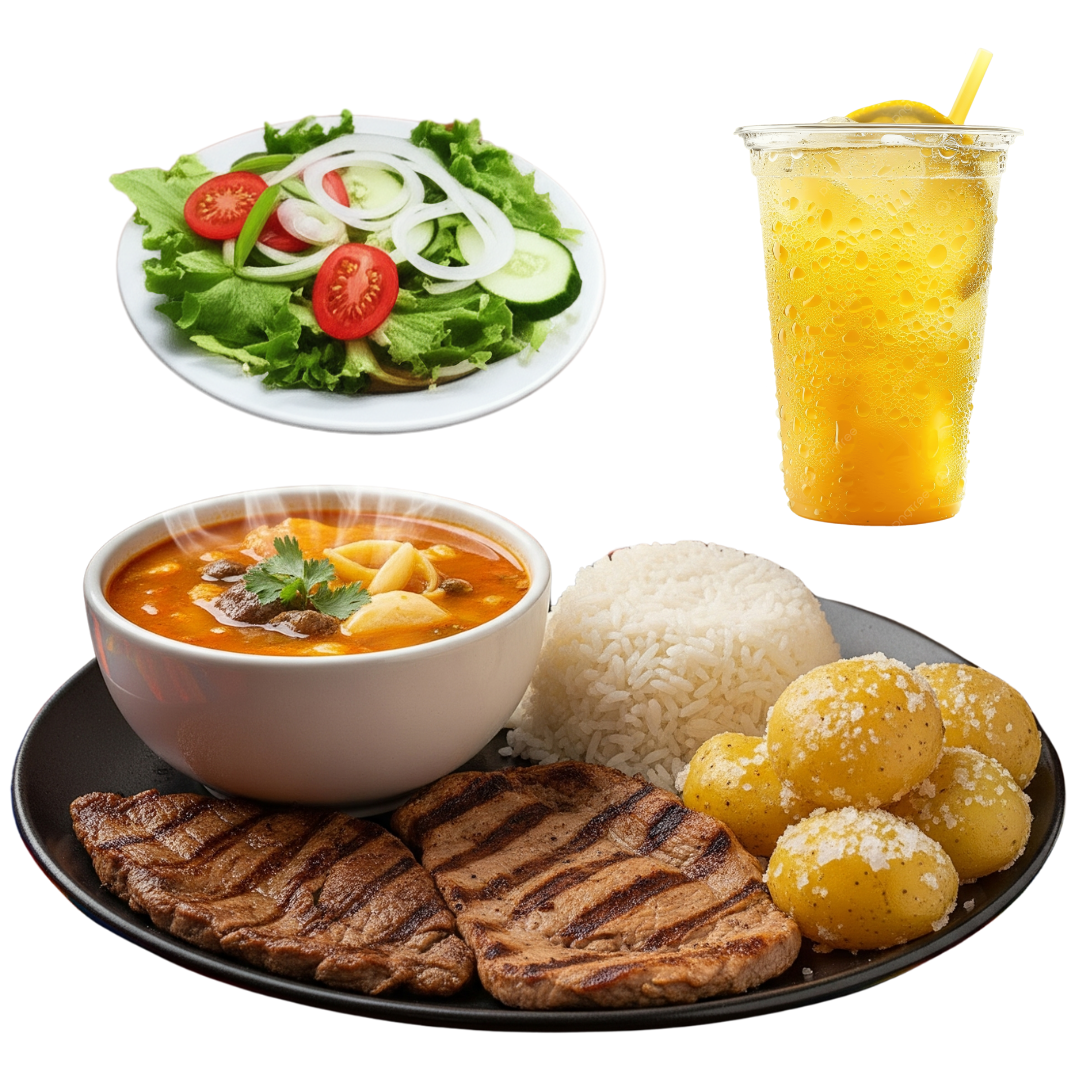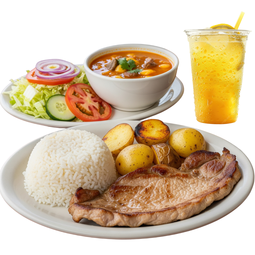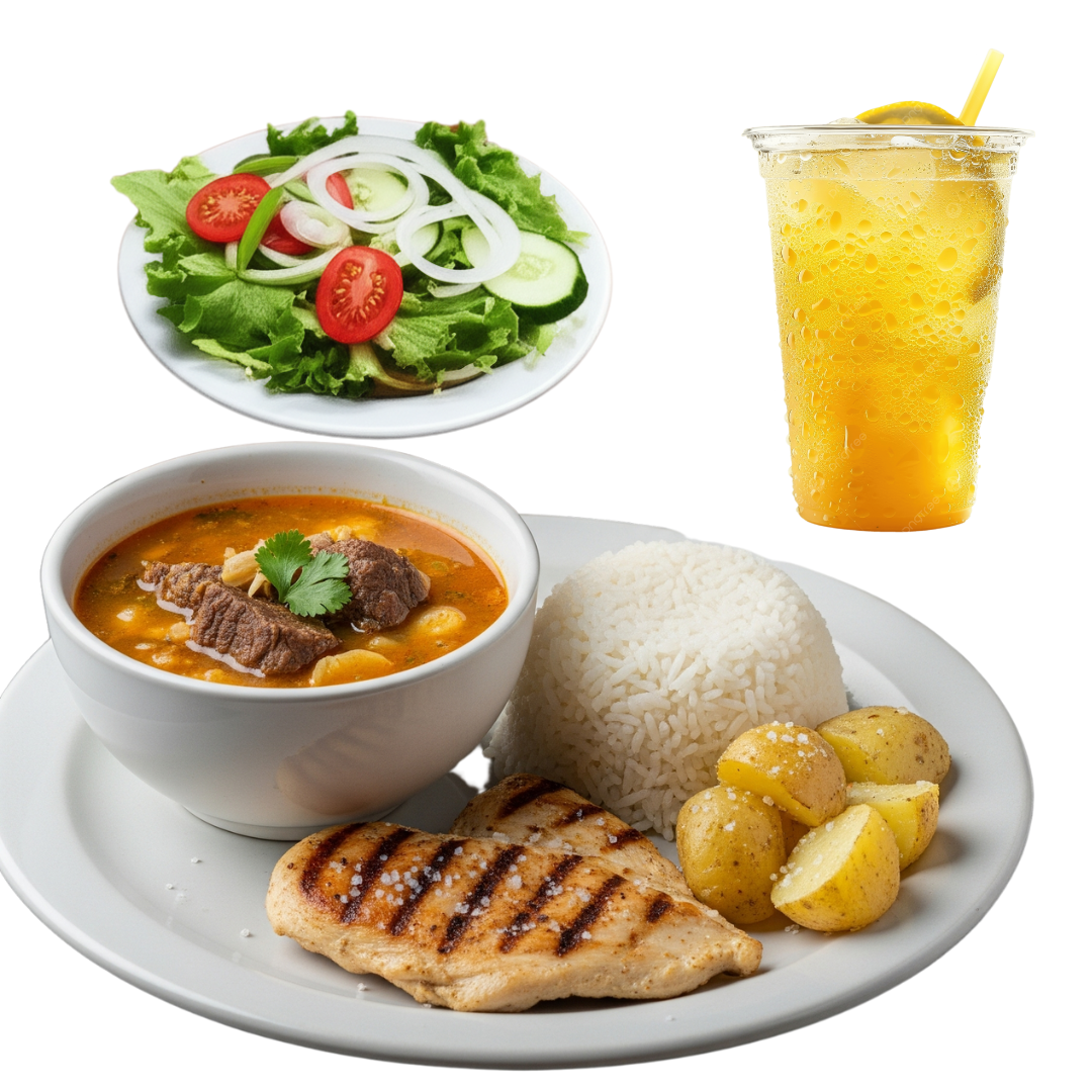 120 g de proteína, arroz, papa salada, ensalada, sopa del día y bebida.