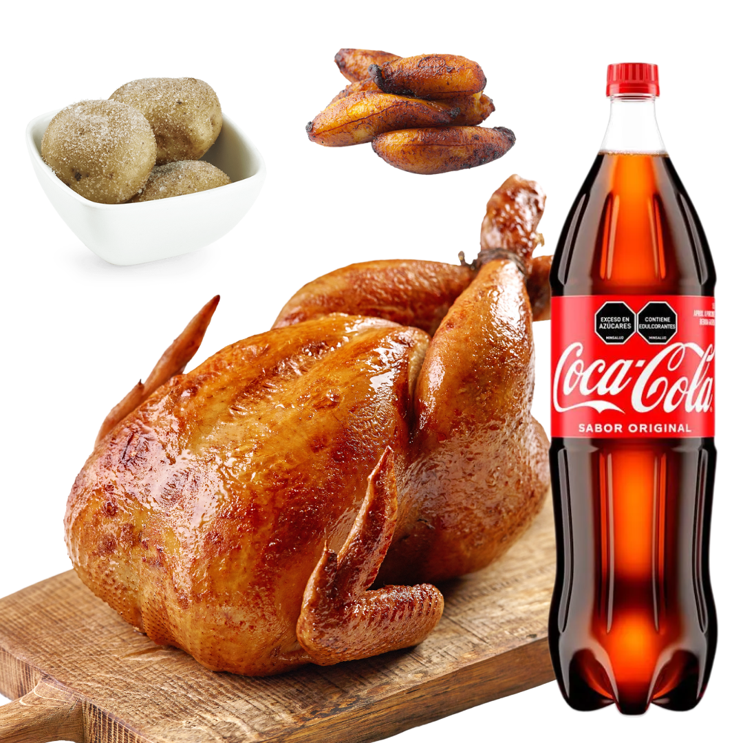 1 POLLO ASADO*1 + Plátano Maduro*1 + Gaseosa Coca-Cola Sabor Original 1.5 L*1 + Porción Arepas*1 + Porción de Papas Saladas*1