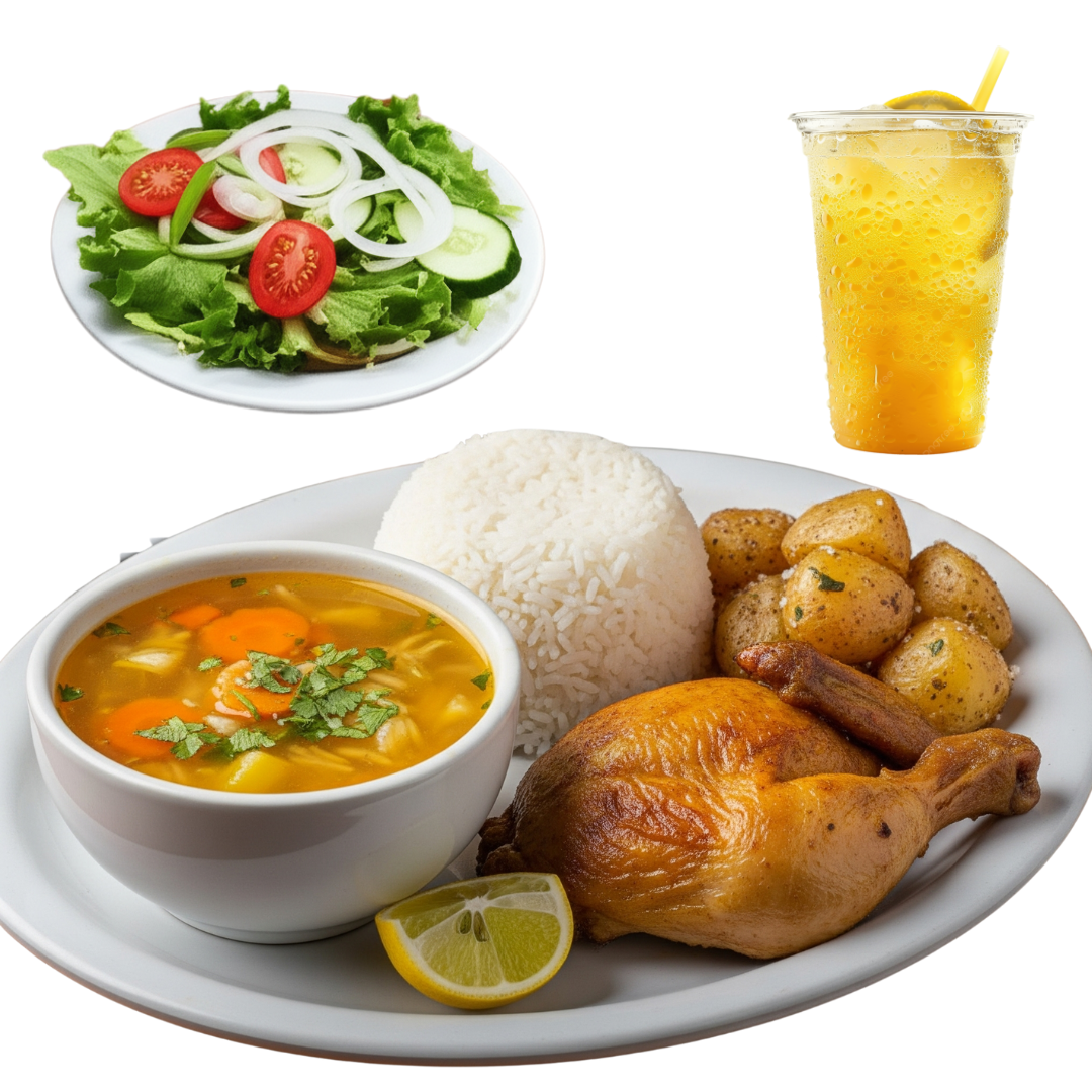 SOPA - ARROZ - (1/4) POLLO ASADO - PAPA SALADA - ENSALADA - BEBIDA 250 ML