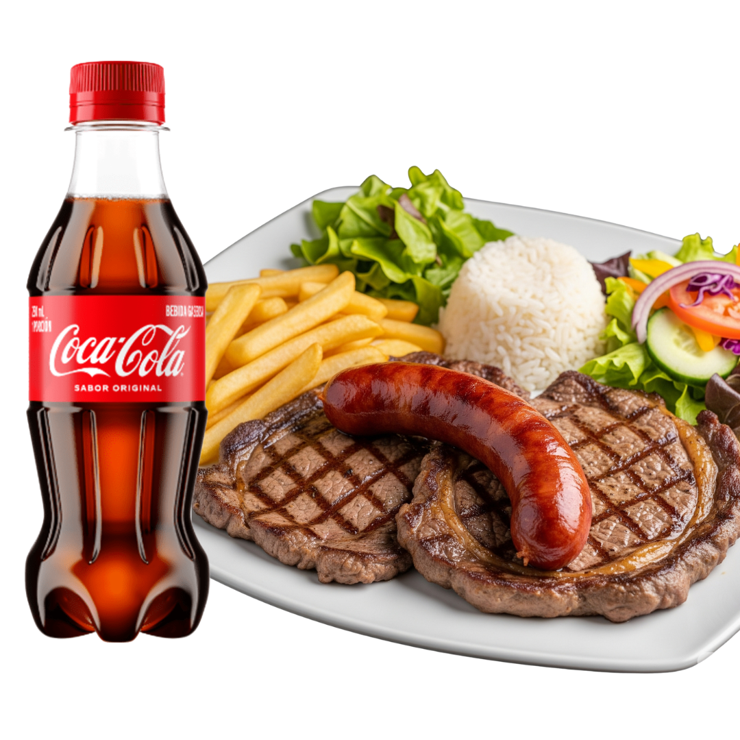 (200 GRS) CHURRASCO - (1/2) CHORIZO - (120 GRS) PAPA FRANCESA - ARROZ - ENSALADA - GASEOSA 250 ML