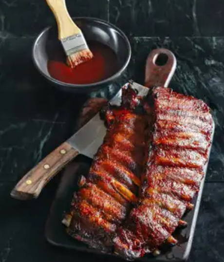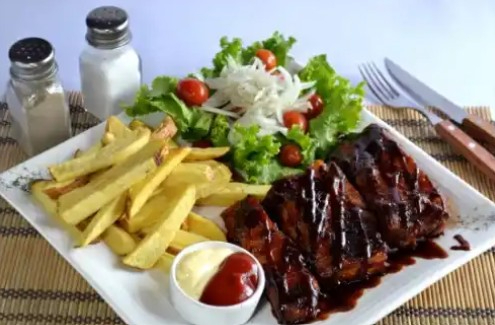 Costillas de cerdo 200 g, ahumadas BBQ, papa francesa, ensalada de la casa.