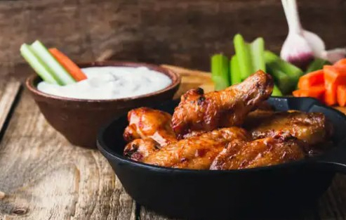 5 Alas fritas a la BBQ, papa francesa, ensalada (tomate y lechuga).