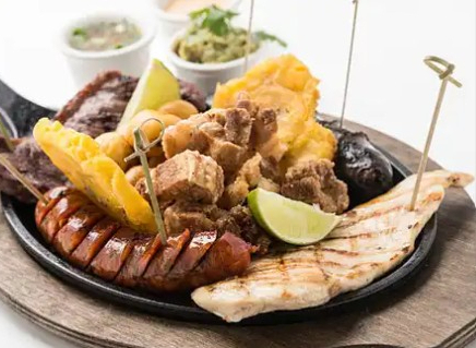 Picada 100 g de chicharrón carnudo, 100 g de carne asada, 100 g de pechuga, 100 g de carne de cerdo, papa criolla, yuca.