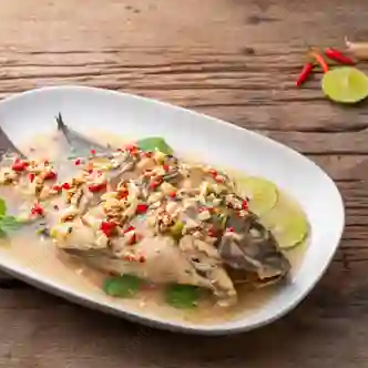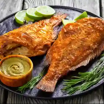 Mojarra frita, limón, arroz, papa francesa, ensalada.