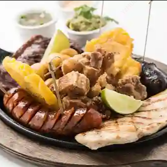 Picada 100 g de chicharrón carnudo, 100 g de carne asada, 100 g de pechuga, 100 gramos de carne de cerdo, papa criolla, yuca.