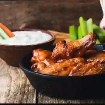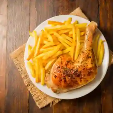 Piernas fritas, arroz, papa francesa, ensalada de la casa.