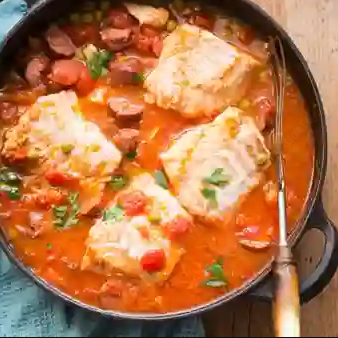 Viudo en salsa, yuca en salsa, arroz, ensalada.