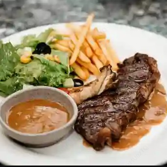 Churrasco 200 g, arroz, papa francesa, ensalada de la casa.
