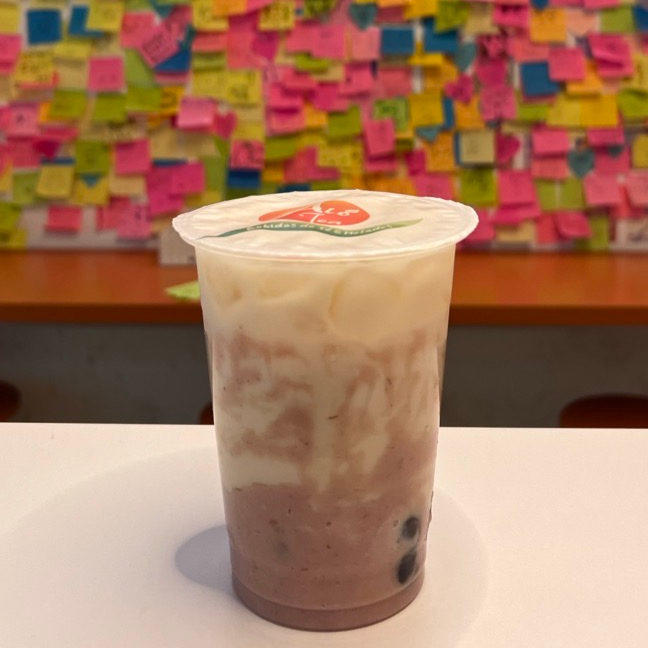 Puré de taro + crema no láctea + té rojo + perla de tapioca