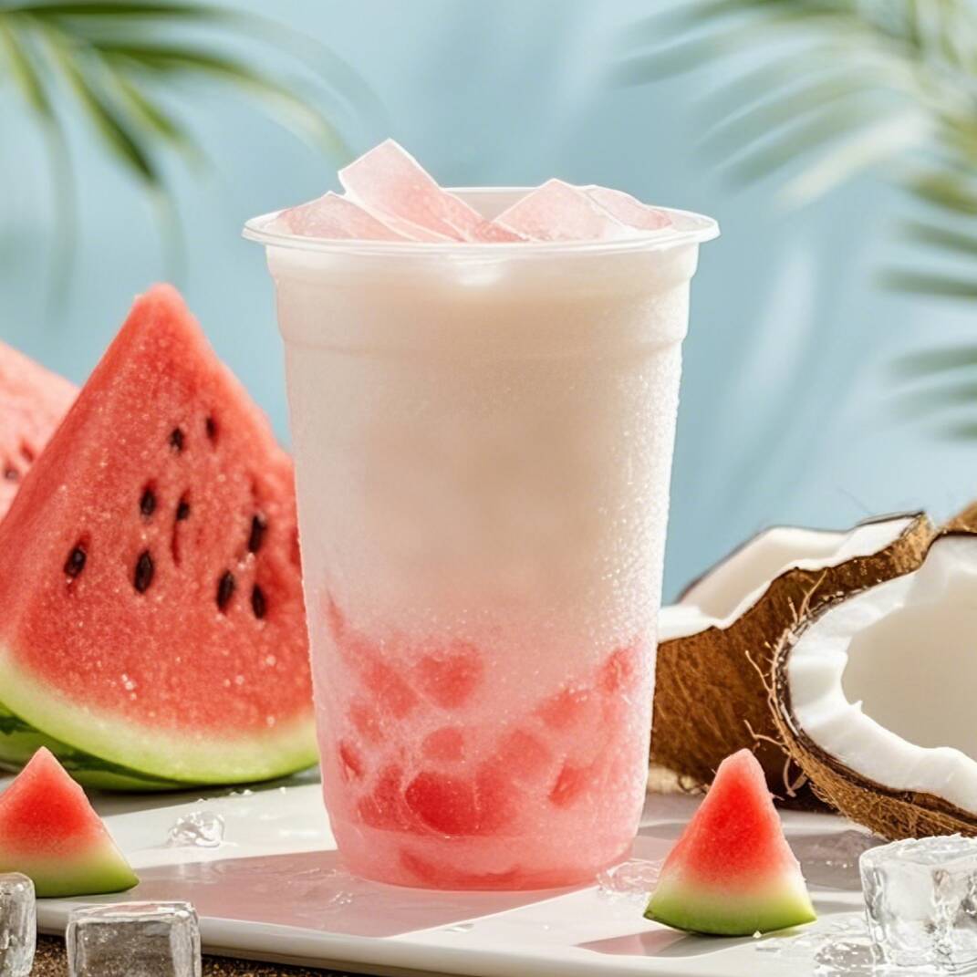 Leche de coco+sandía++gelatina de coco (Aviso: Por el momento no tenemos disponible la gelatina de coco, se va a sustituir con perla de bonbón)