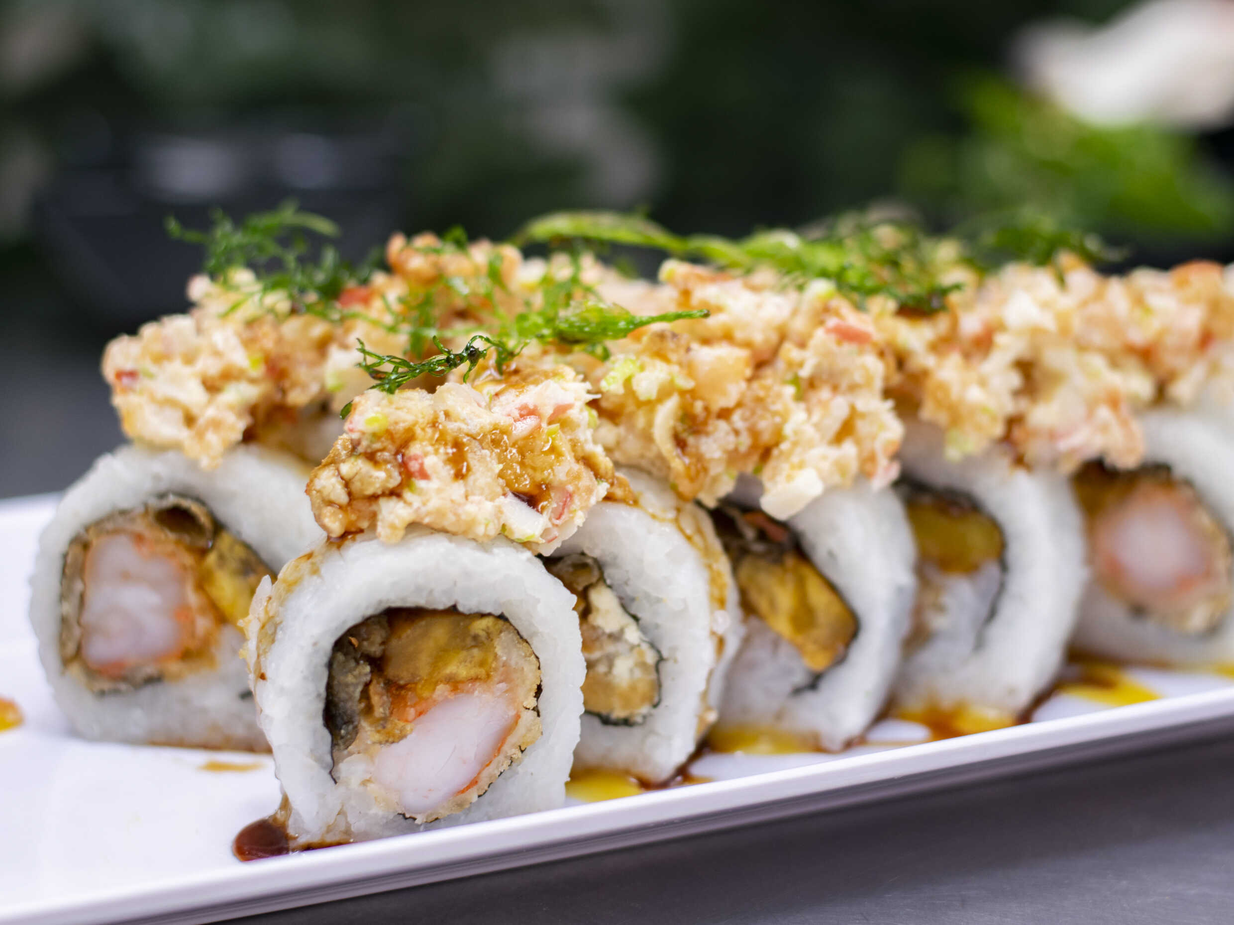 Roll relleno de langostinos, piel de salmón, plátano maduro, queso crema, topping de salsa volcano.