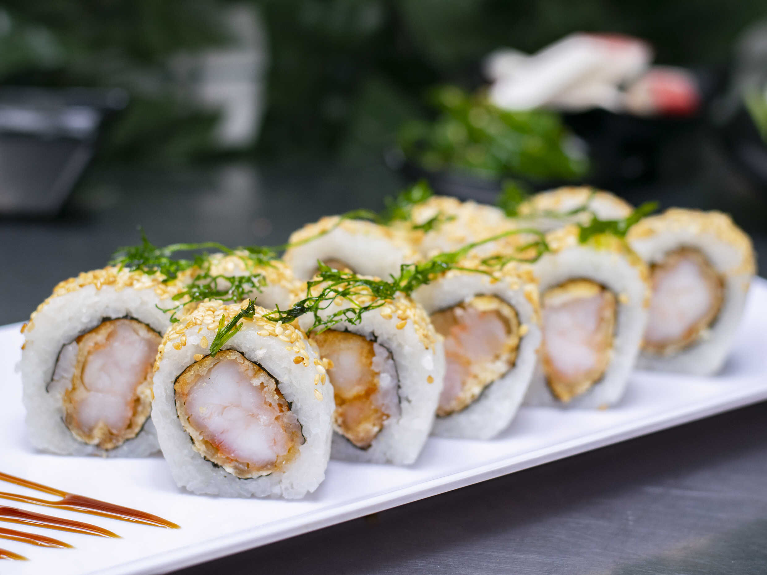 Langostino apanado, palmito de cangrejo, topping de ajonjolí.