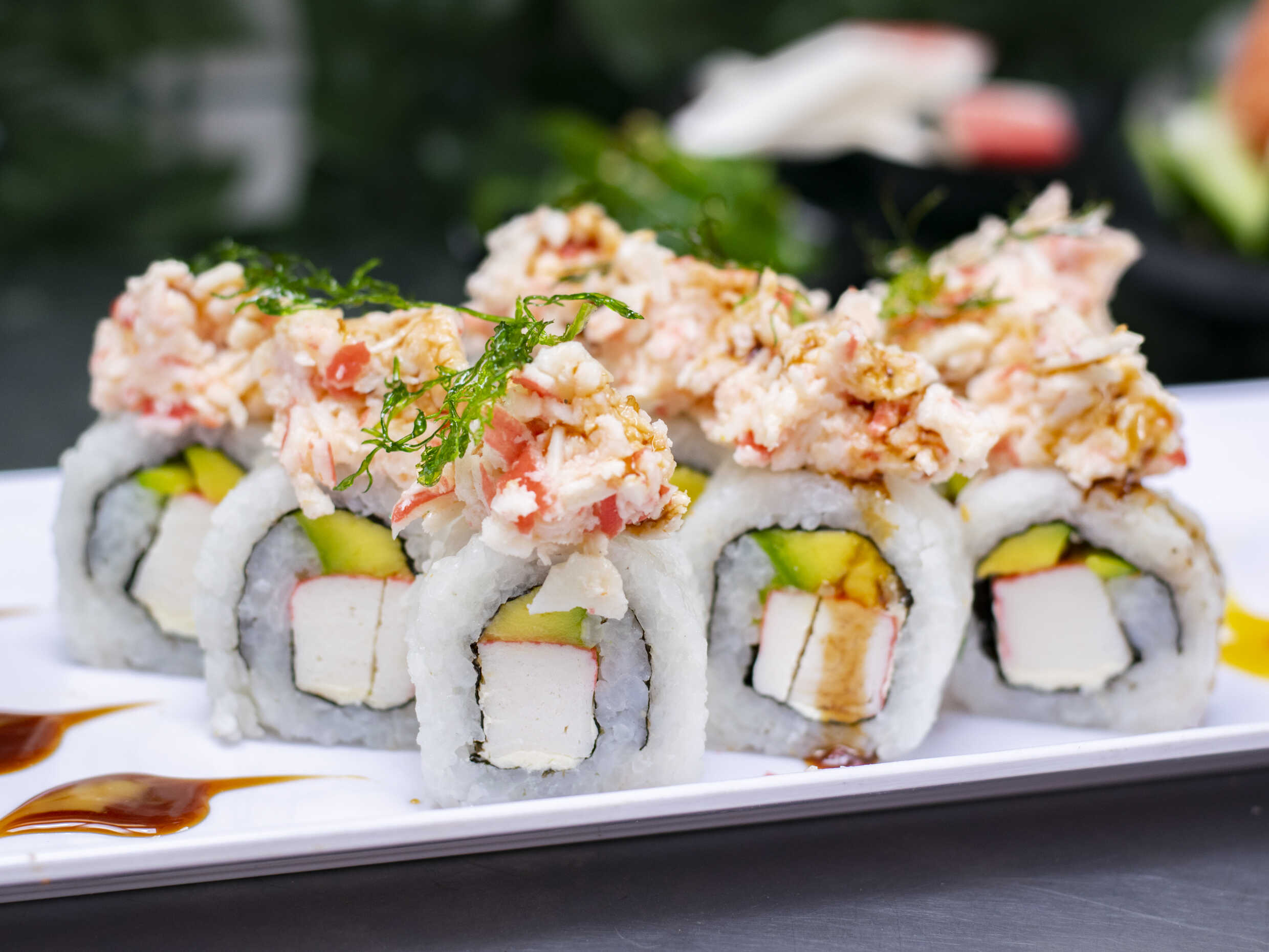 Pamito de cangrejo, aguacate, queso crema, topping de ajonjolí y pasta de dianamita.