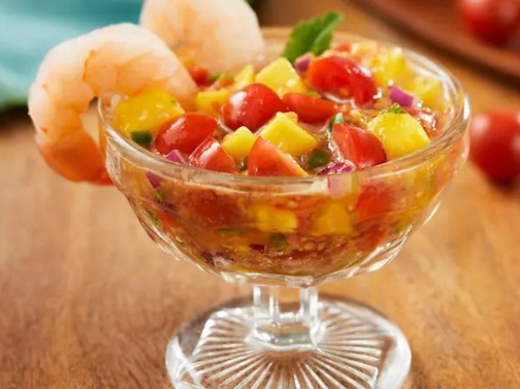 Camarones macerados en limón, sal, piemienta, ajinimoto, salsa de tomate, mango, miel.