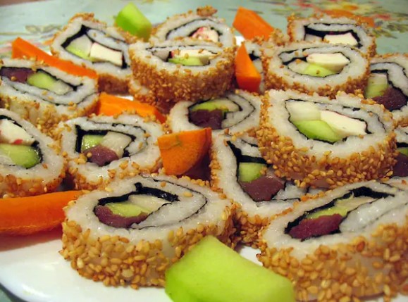 Calamar apanado, aguacate, queso crema y topping de ajonjolí.