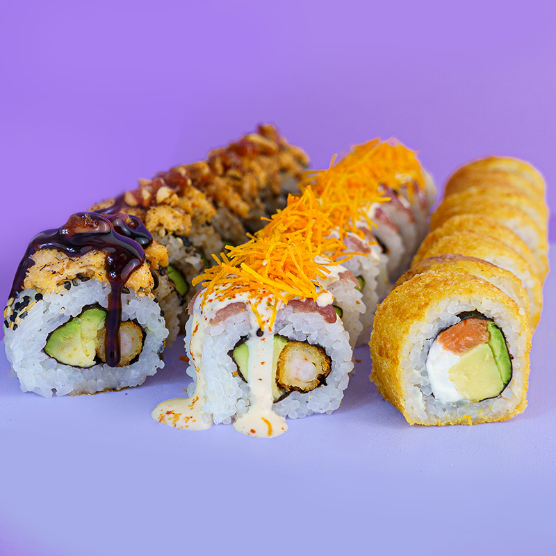 Incluye 6 sabores, 30 makis. 5 California, 5 Filadelfia , 5 apanado roll, 5 salmón crispy, 5 salmón skin, 5 tiger roll.
