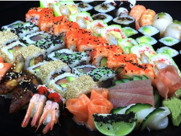 70 bocados de sushi +postre oreos tempuras bañadas en leche condensada + 12 kanicrunk + 1 ensalada de cangrejo+ 1 gaseosa de 1.5 l