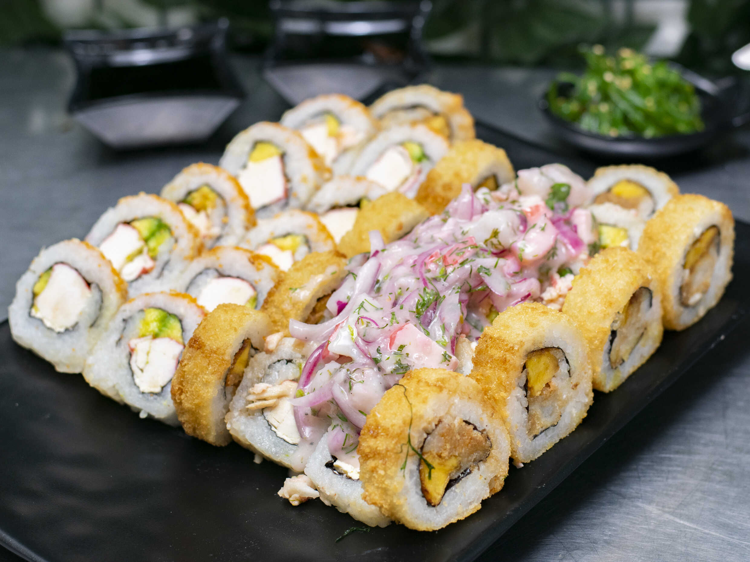 Salmón, atún, palmito y aguacate forrado con algas marinas y salsa ponzu.