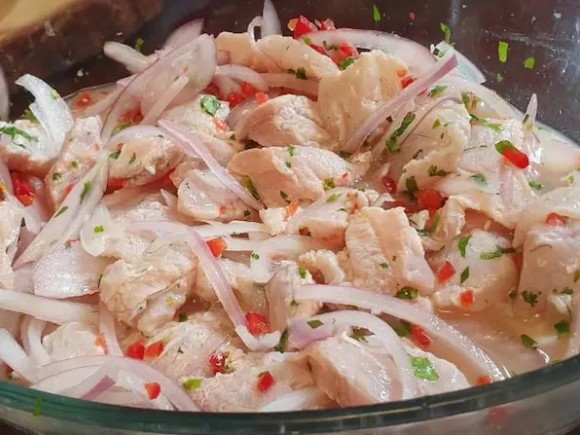Pez blanco macerado con limón, sal, pimienta, ajinomoto, cialntro, pepino, leche de tigre.
