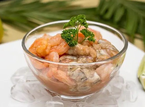 Camarón, langostino, calamar, salmón, atún, tilapia, cangrejo, macerado de limón, sal, pimienta, ajinomoto, salsa de tomate, cebolla, cilantro, miel.