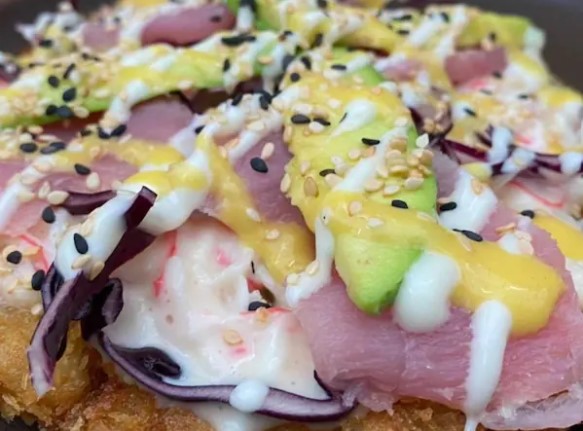 Vegetales tempura, aguacate, queso crema y topping de ajonjolí y atún, cebollin y salsa picante.