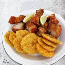 Trozos de chicharron con cebolla morada, tomate, mango y un toque de limon