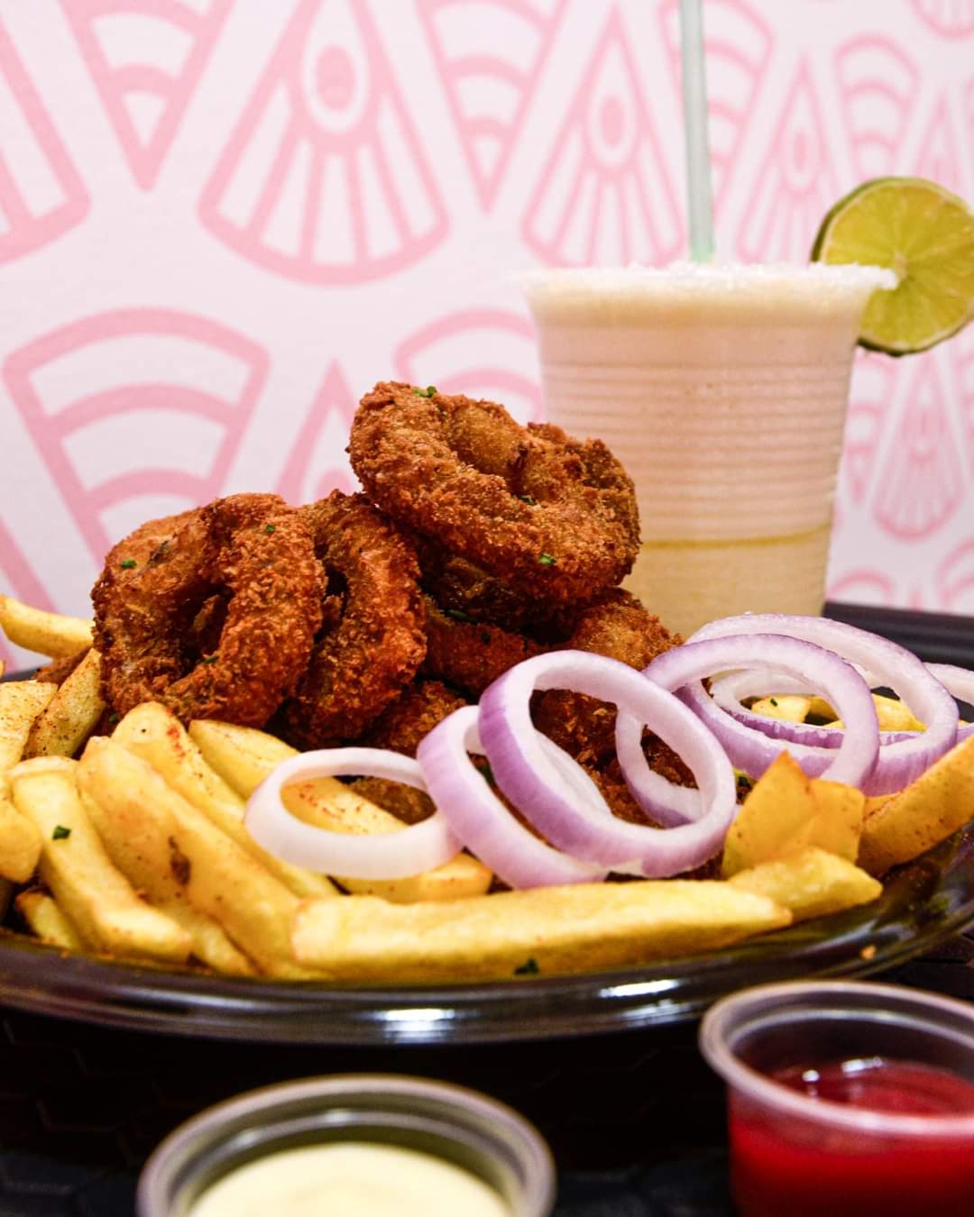 Aritos de cebolla tempurizado en panko con papa a la francesa.