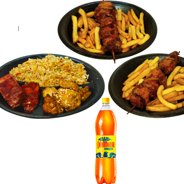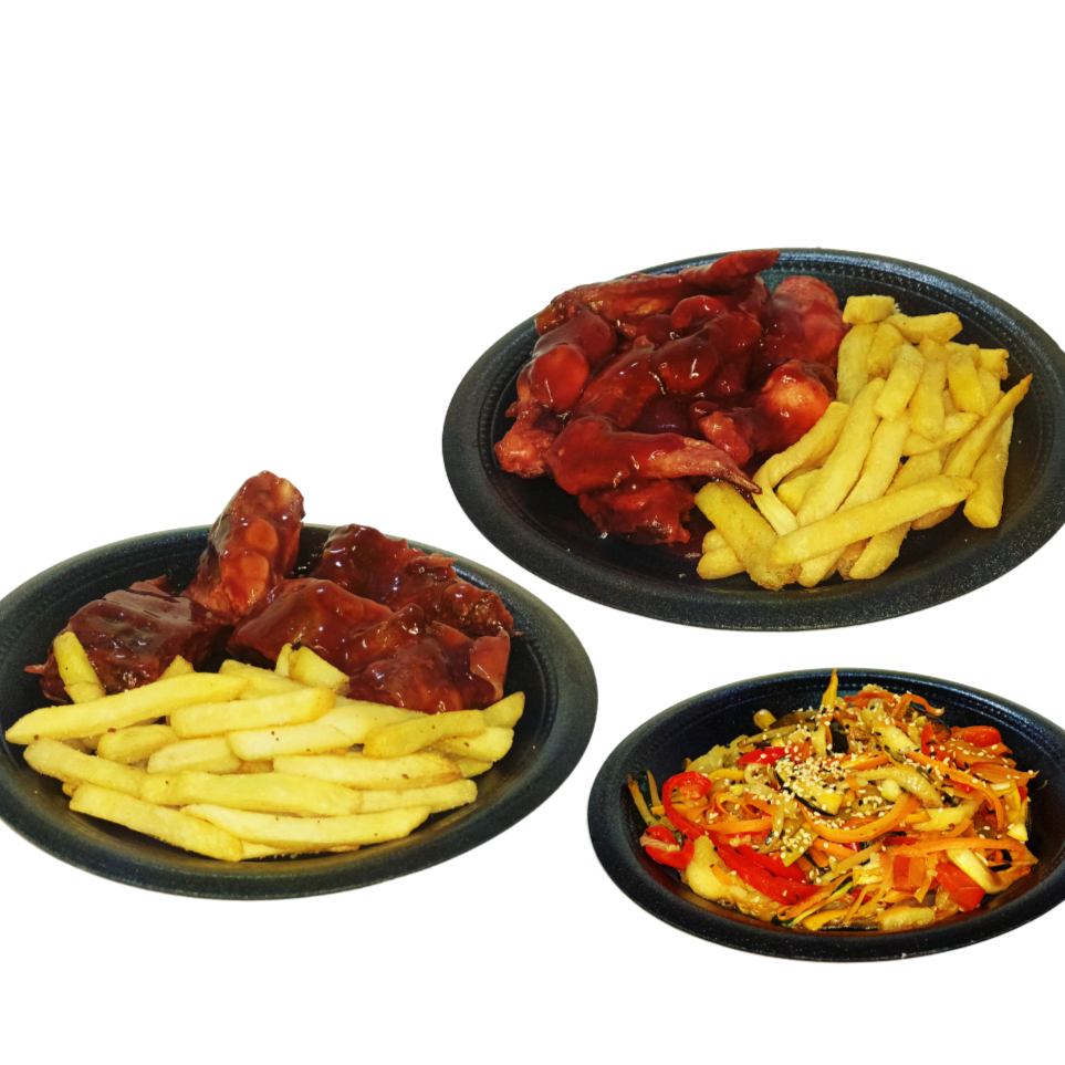 250 gr de costilla bbq + 250 gr de alitas bbq, (vegetales al wok, arroz o pasta con vegetales) + 2 porciones de papa a la francesa + gaseosa postobon 1.5