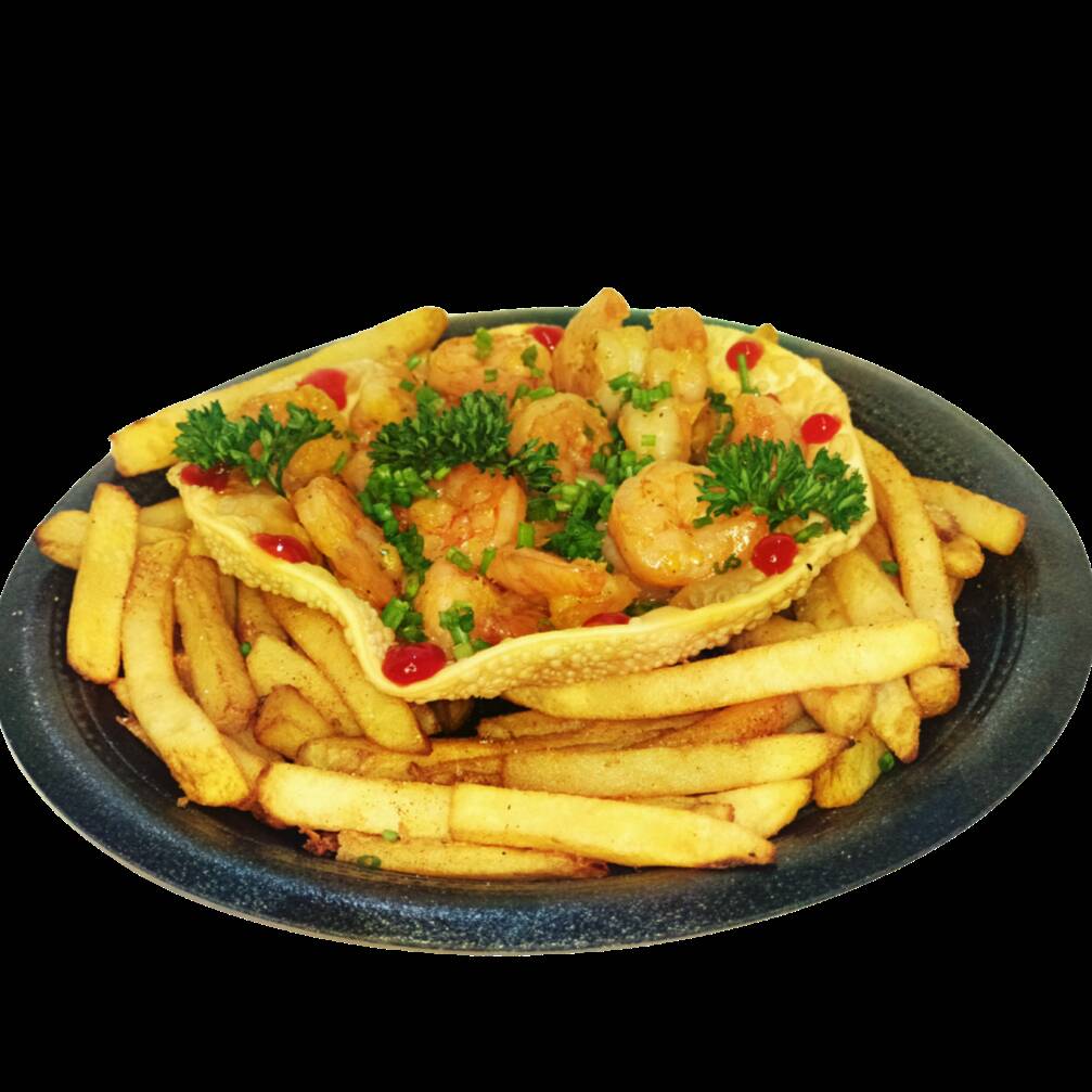 250 gr de camarones, pasta de ajo, mantequilla, servido en cesta de tortilla + 150 gr de papa a la francesa