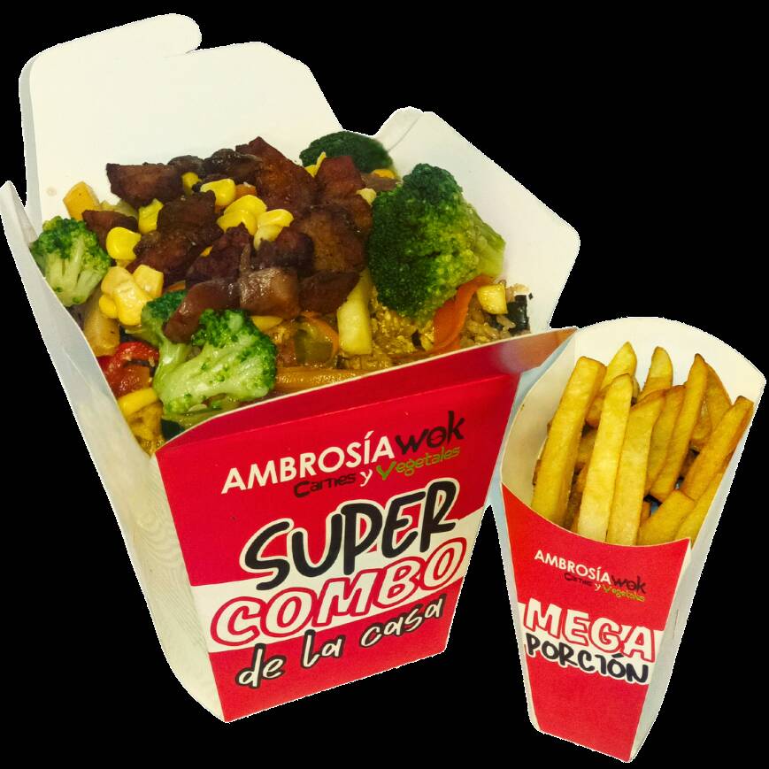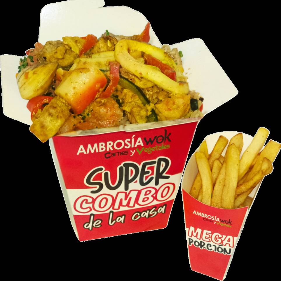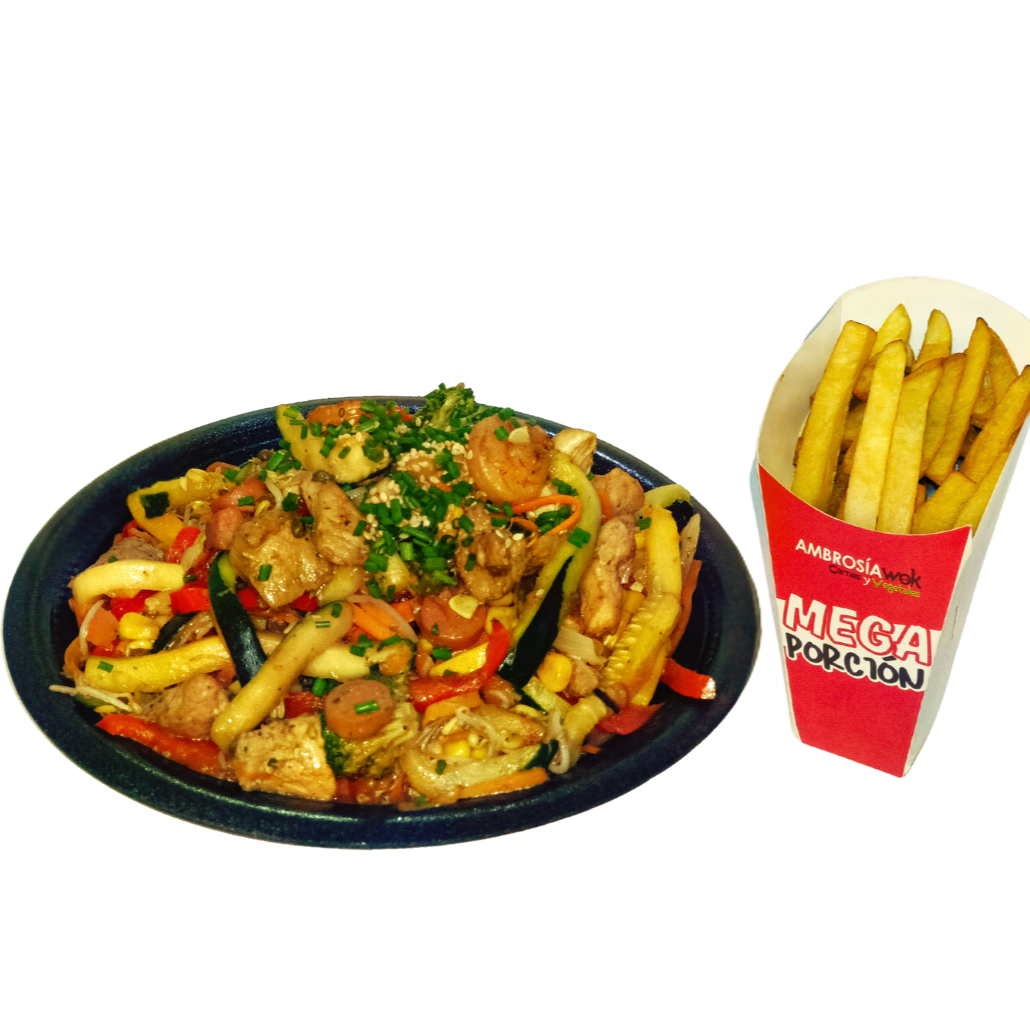 Camarón, cerdo, pollo y salchicha, maiz tierno, champiñones, zucchini verde y amarillo, pimentón, raices chinas. Todo salteado al wok + 150 gr de papa a la francesa