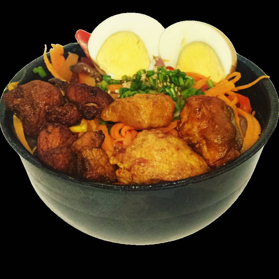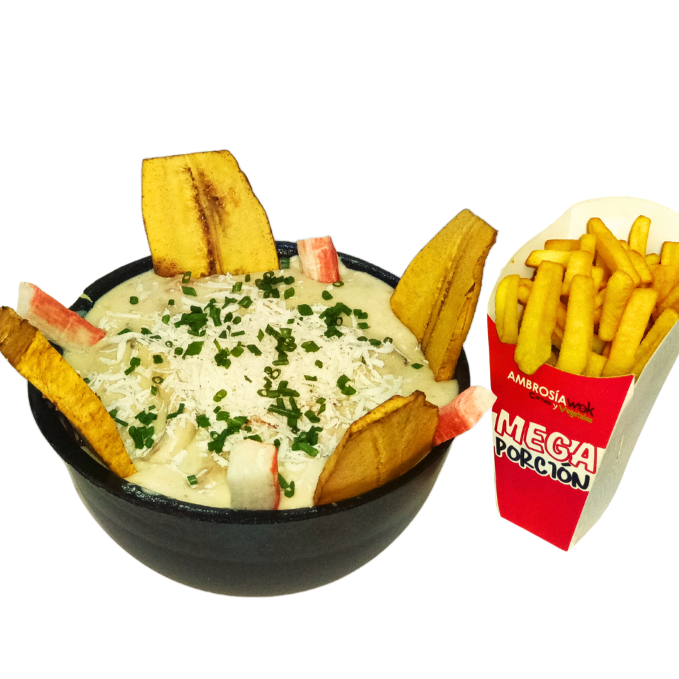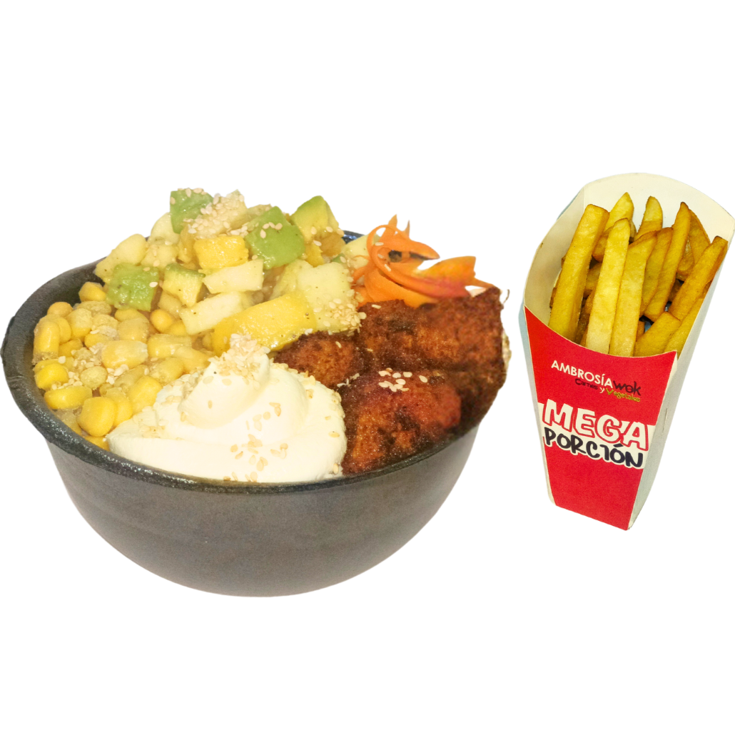Jamón, cabano, trocitos de pollo, raices chinas, cebollin picado. Acompañado de una presa de pollo + 150 gr de papa a la francesa