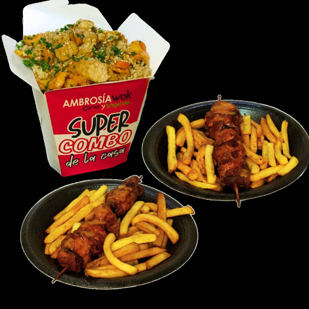 Arroz cantones (camarón, cerdo, pollo, y salchicha, maiz tierno, champiñones, zuchinni verde y amarillo, pimentón, raices chinas. todo salteado al wok) + dos brochetas tempurizadas + dos porciones de papa a la francesa