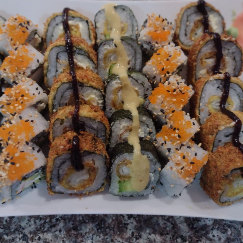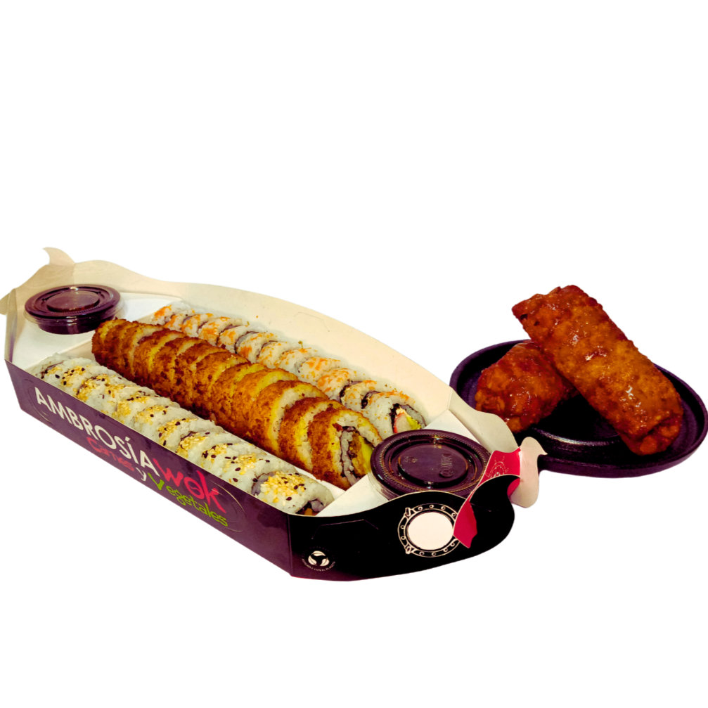 Sushi 30 piezas. 10 piezas tempura: pescado blanco apanado, aguacate, queso crema, panko rollo temporizado, 10 piezas ambrosia roll: salmón crudo, queso crema, mango, topping de ajonjolí, 10 piezas california: palmito de cangrejo, queso crema, aguacate, topping de masago, 2 lumpias, rollitos primavera rellenos de trocitos de jamón, vegetales y pollo.