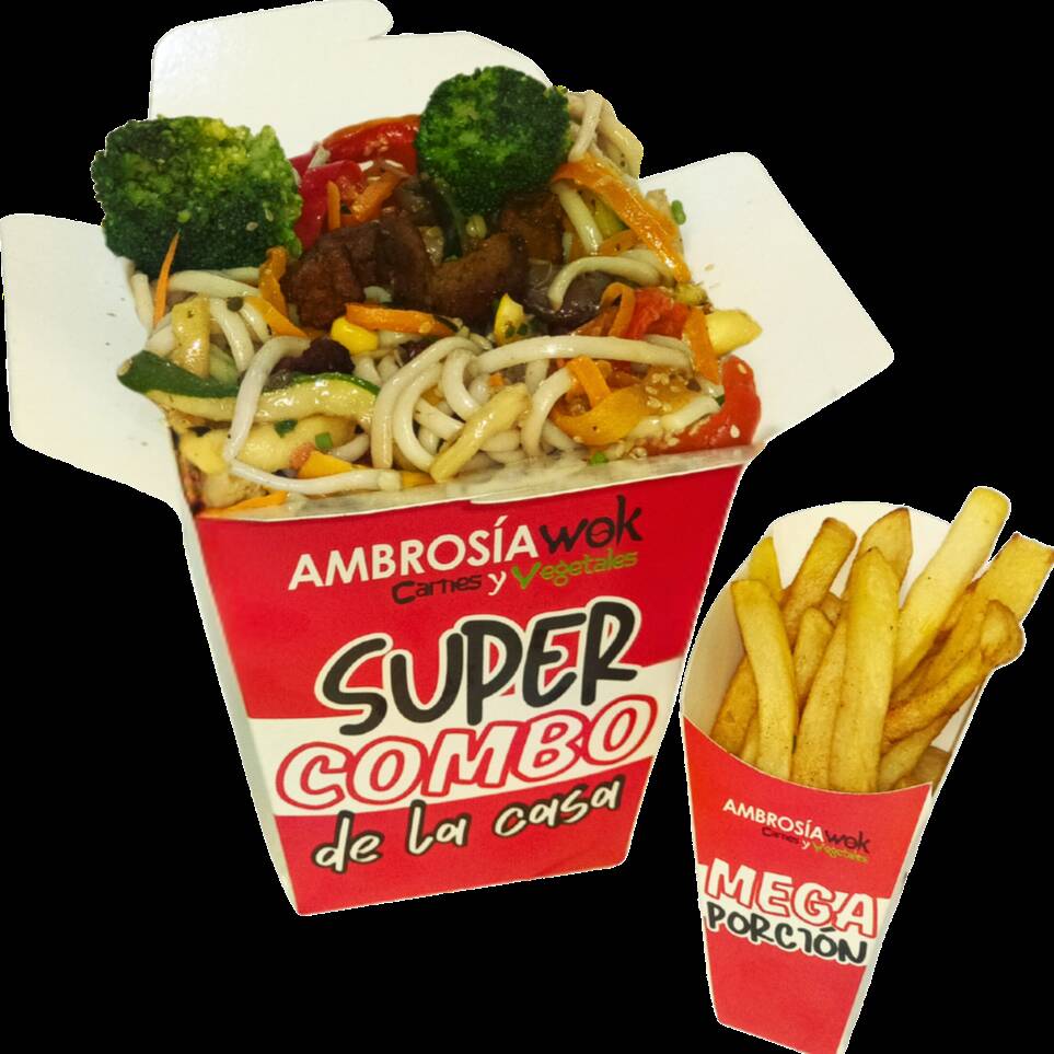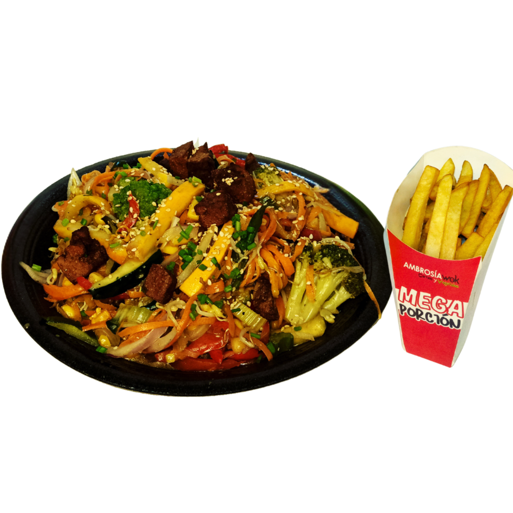 Espagueti, pimentón, cebollas, zanahoria, brócoli, champiñones, maíz tierno, zucchini verde y amarillo, raíces chinas, Todo salteado al wok + salsa soya. Acompañado de 150 gr de papa a la francesa