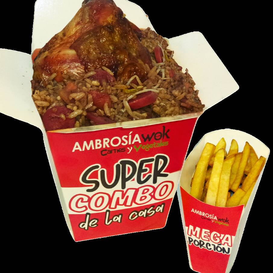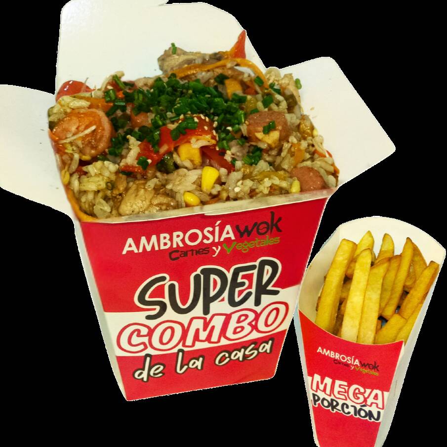 Arroz con camarones, res, cerdo, pollo, salchicha. Sazonado en vegetales, raíces chinas, soya. Todo salteado al wok, CON TAMAÑO A ELEGIR (Incluye papa francesa).